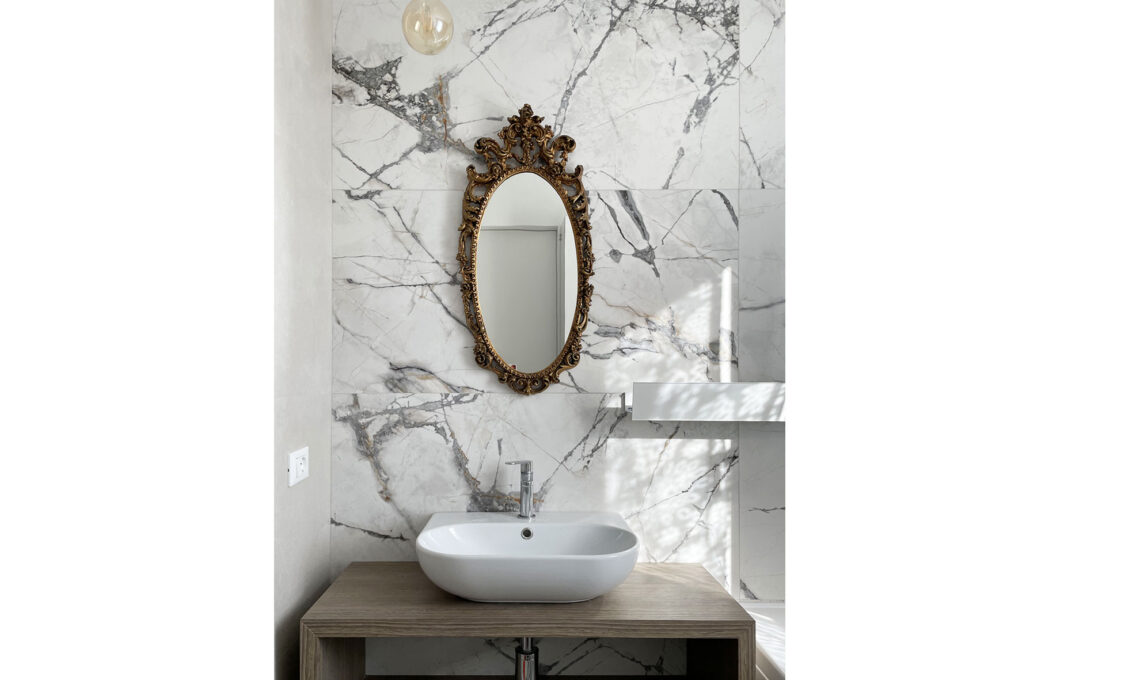 I bagni del piano primo sono invece più essenziali ed eleganti, con un rivestimento gres effetto marmo dalle venature azzurro carta da zucchero. ( The Room di Ceramica Imola).