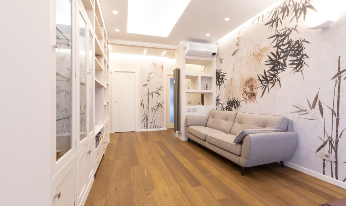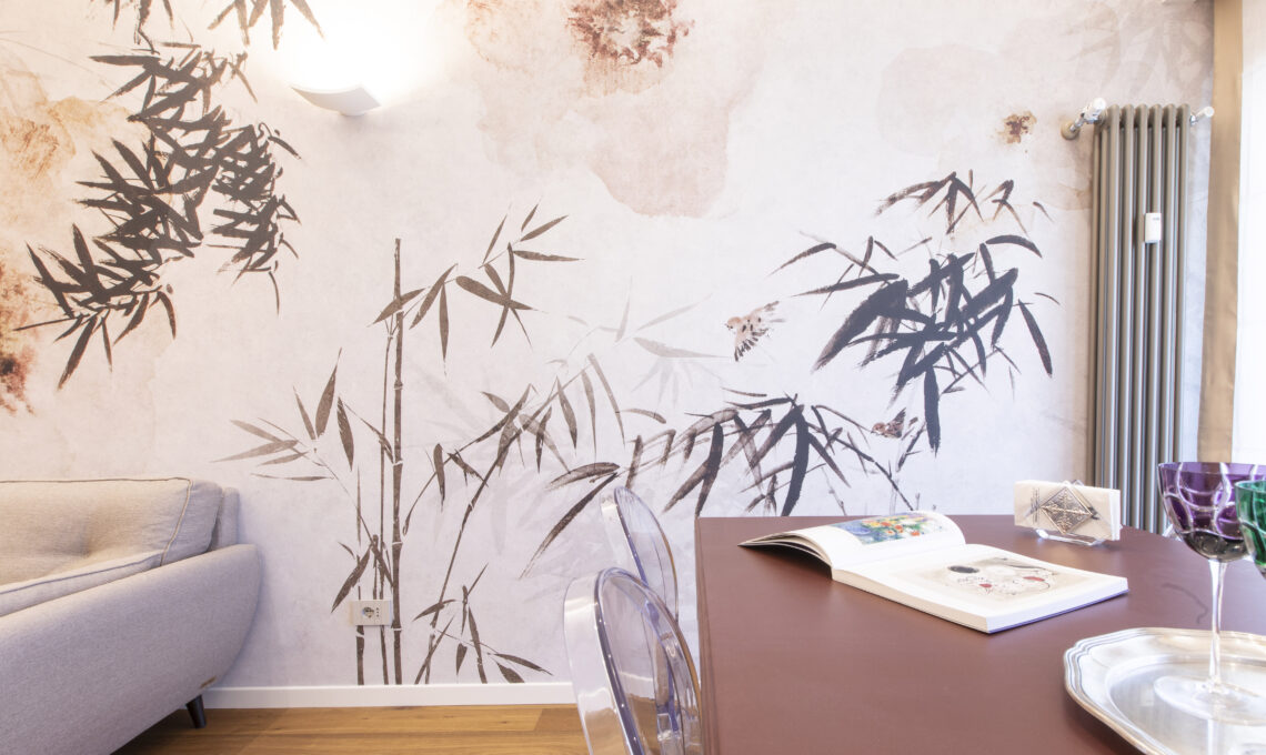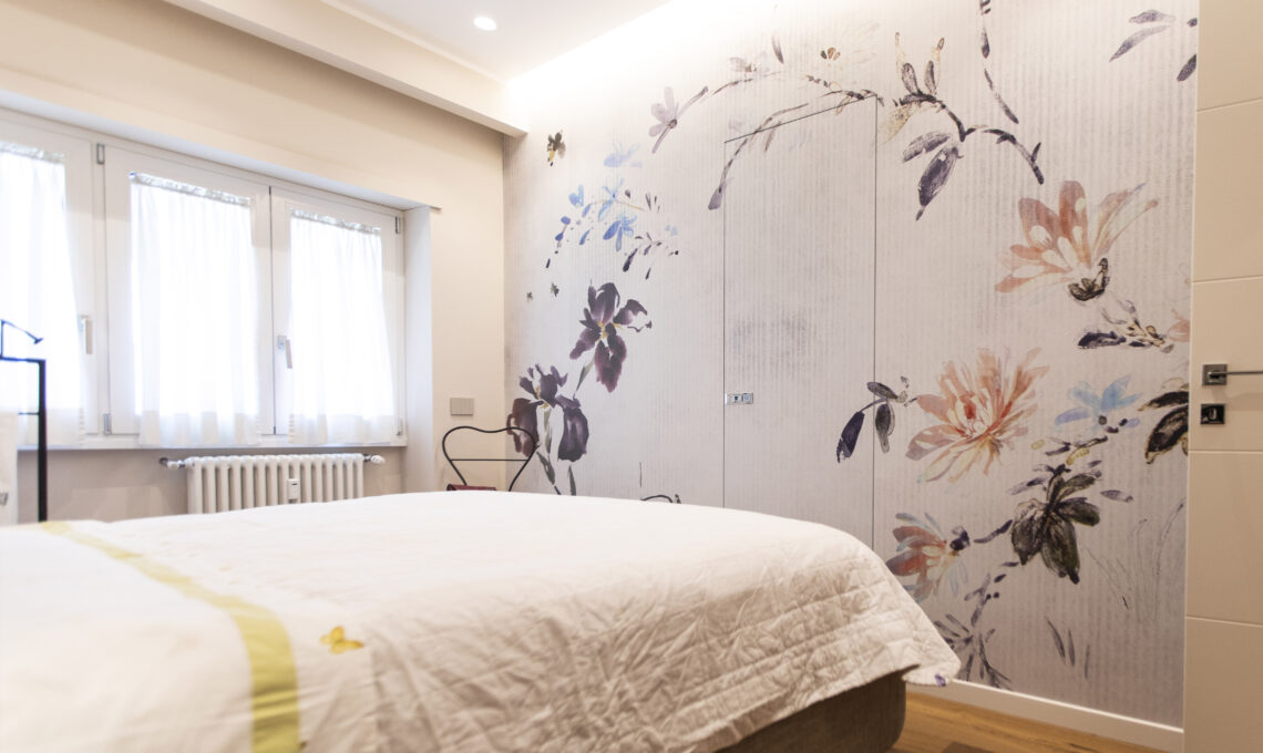 Questa casa è l’incontra tra donna e natura, proprio come immaginata dalla mia cliente, l’uso dei colori, dei rivestimenti, delle soluzioni, fa tutto parte di una grande visione, di una casa immaginata nei minimi dettagli. E quindi ecco grandi pareti rivestite da carta da parati a tema naturale; foglie vegetazione, fiori, tutti diversi ma in qualche modo tutti collegati, una palette di fondo ben precisa che aiuta a unire tutti gli elementi.