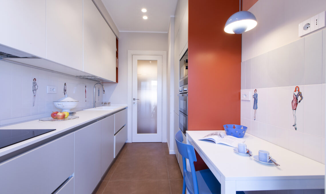 Il tema della donna che trova il suo massimo nella cucina, piccola ma essenziale, che acquista il suo carattere dirompente e dinamico attraverso il colore e il rivestimento, mattonelle monocolore interrotte da mattonelle con figure femminili stilizzate, ognuna diversa dall’altra ma con un tono arancione ricorrente, un gioco di linee e sfumature molto armonioso che viene richiamato dalla parete di fondo arancione e dai vani giorno, troppo colore in una cucina piccola e stretta poteva risultare pesante, mentre in questo modo, posizionato in angoli non immediatamente visibili entrando, c’è ma non si vede.