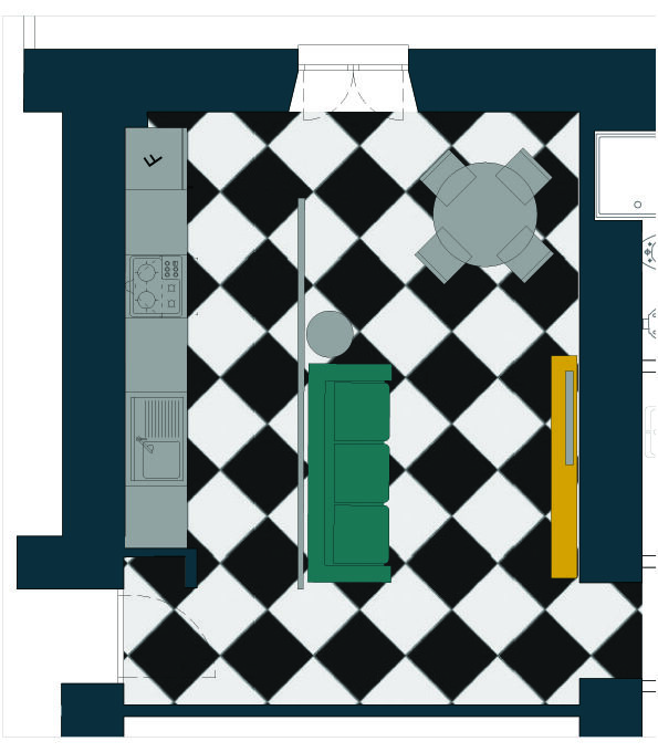 Si tratta di una stanza rettangolare di circa 4,70X5,70 metri in cui devono convivere l'ingresso, la zona living con pranzo ed un angolo cottura, che consenta di cucinare comodamente.