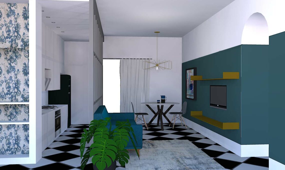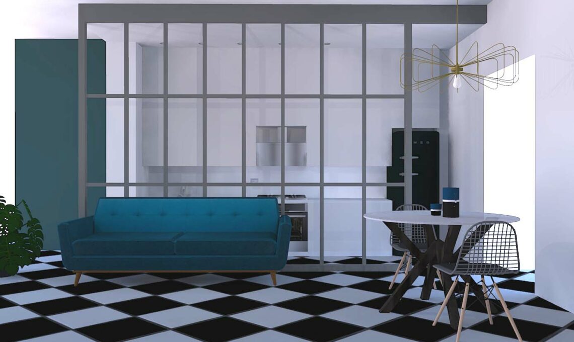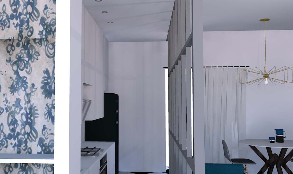 La stanza presenta un bel pavimento a scacchiera bianco e nero che la cliente voleva sostituire; le ho invece suggerito di conservalo, valorizzandolo con una tinteggiatura delle pareti in un intenso blu ottanio che faccia pensare al vicino mare. Stesso colore anche per il divano e per i decori della carta da parati che fodera la nicchia da realizzare in cartongesso vicino alla porta d’ingresso.