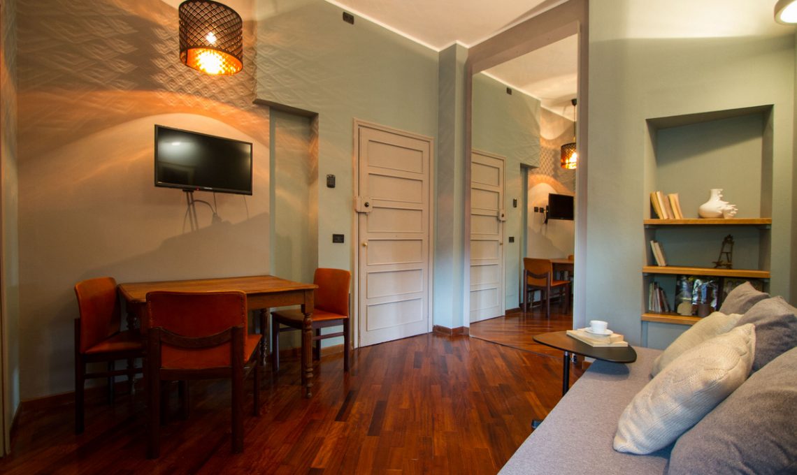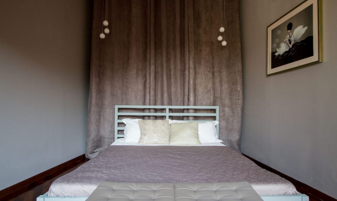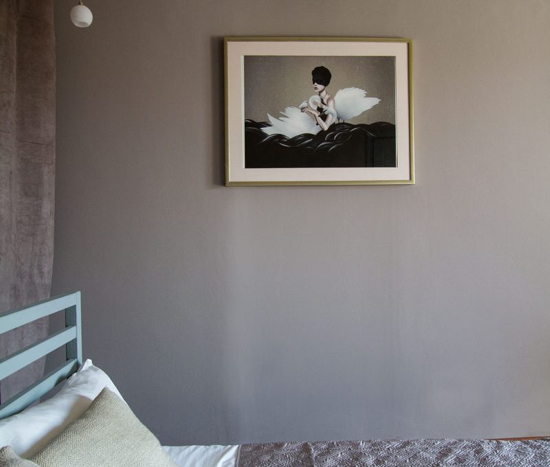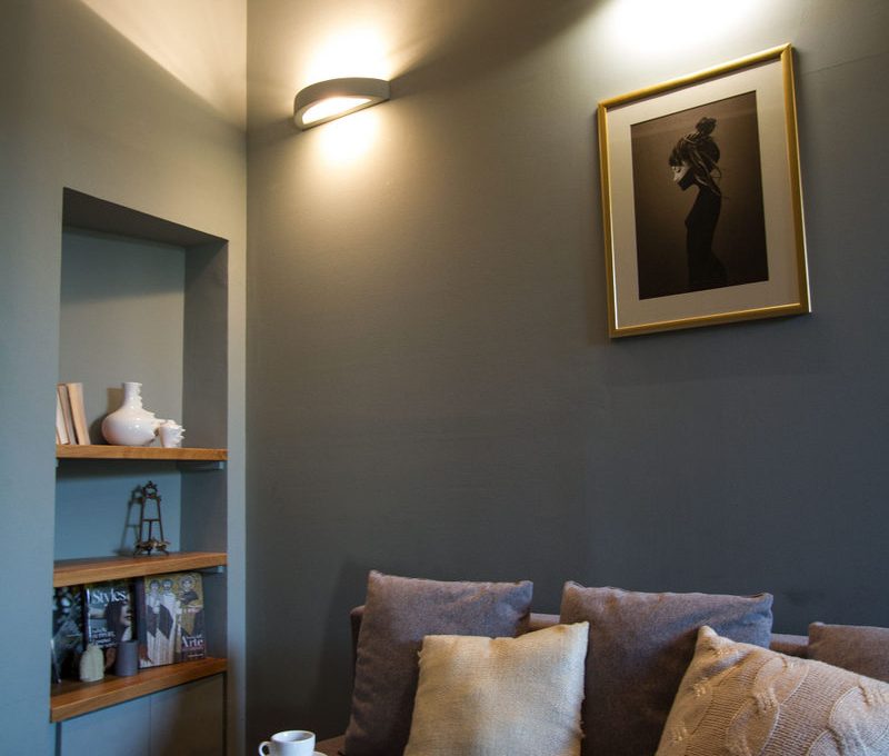 - Appartamento verde e tonalità del grigio scuro è stato progettato per affitti a breve termine. Abbiamo deciso di sperimentare con colori scuri ed elementi dorati.