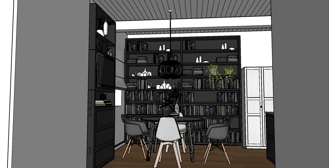 Il colore scelto per la libreria ed il mobile tv è il grigio antracite, per riprendere la cucina, il tutto scaldato dal legno del pavimento e del tavolo tondo a 8 posti.