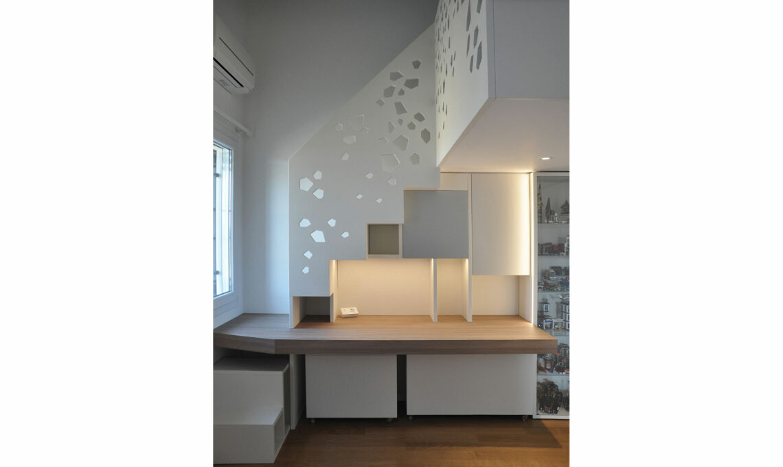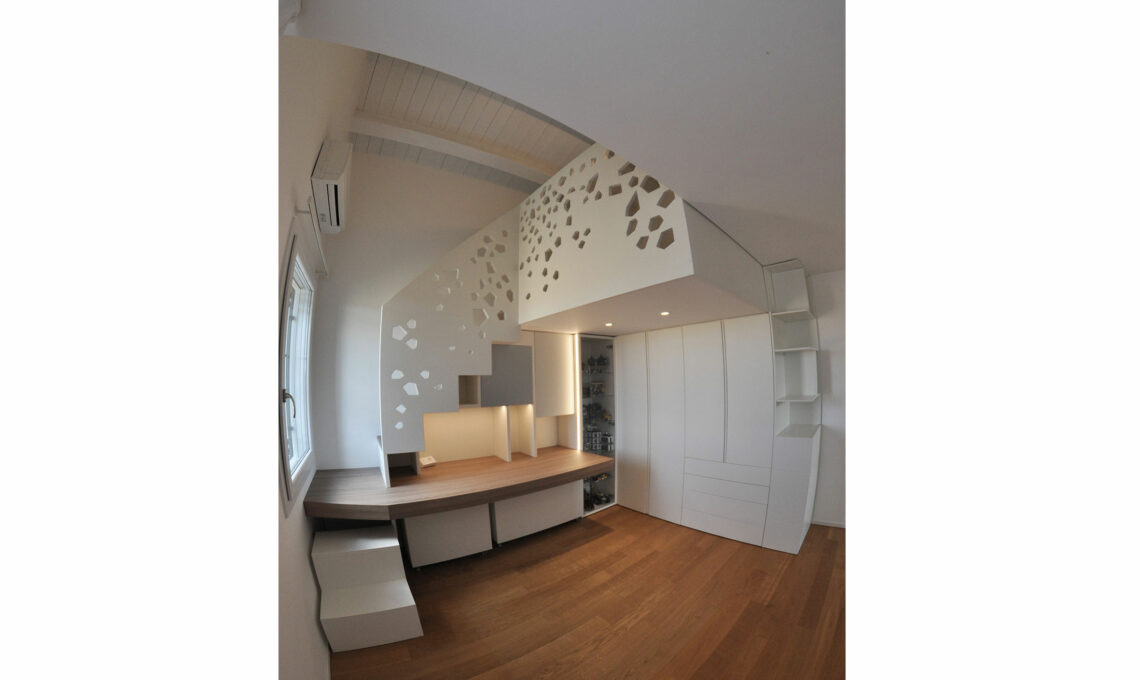 La scala è la vera la protagonista del progetto di interni. Uno dei gradini si allunga a diventare il piano della scrivania, mentre, per ottimizzare gli spazi, si è scelta una soluzione di arredo per cui la struttura della scala si trasforma in una libreria illuminata da tagli di luce a led. Il parapetto è l’elemento che caratterizza visivamente tutto il progetto di interior design.