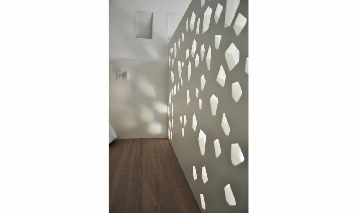 La trama dei fori irregolari, la cui densità cambia di punto in punto, dà movimento alla composizione, creando un gioco di trasparenze e proiettando forme di luce irregolari sulla parete. Si ottiene così un’atmosfera calda e sognante, senza rinunciare a linee di design moderno e ad uno stile contemporaneo.