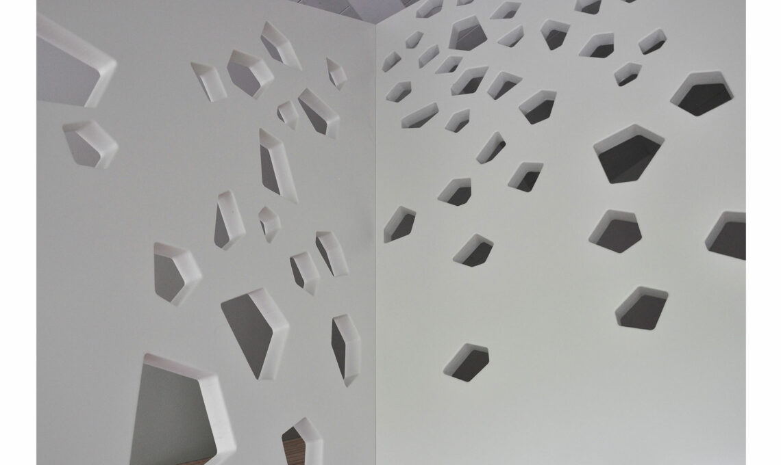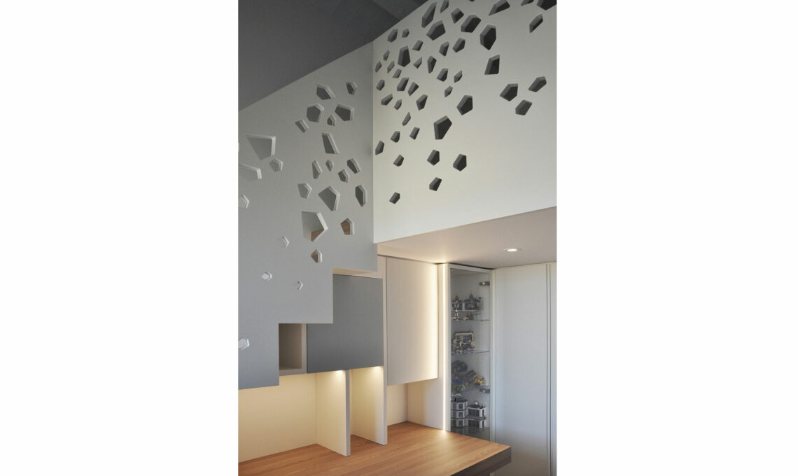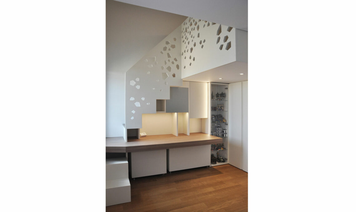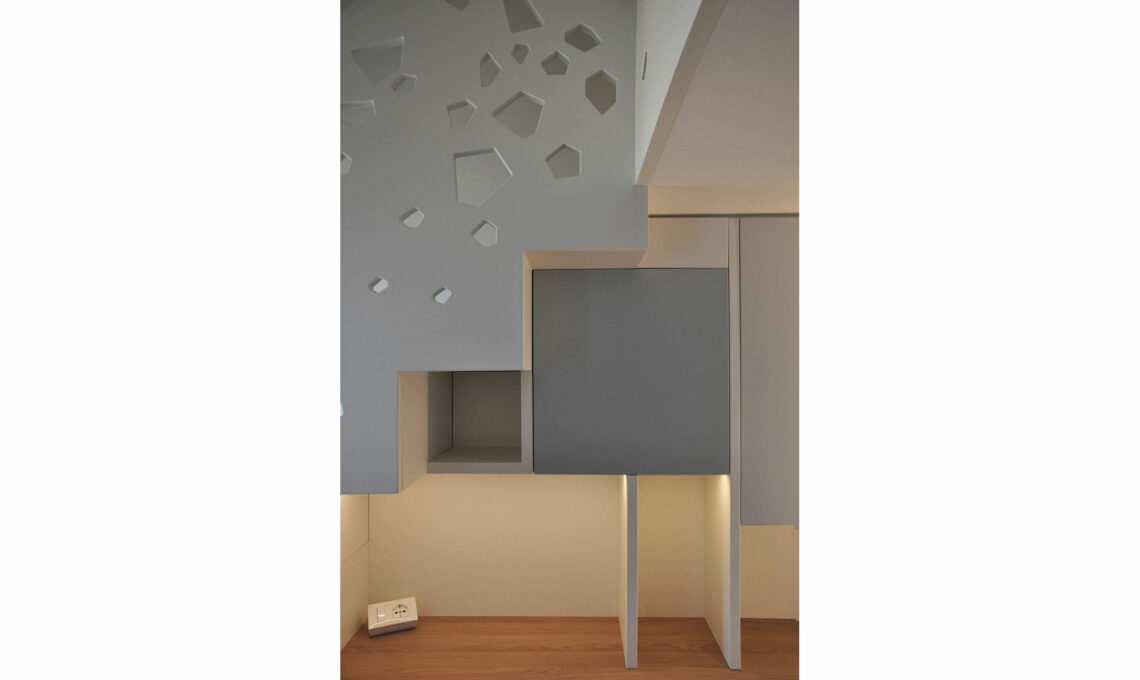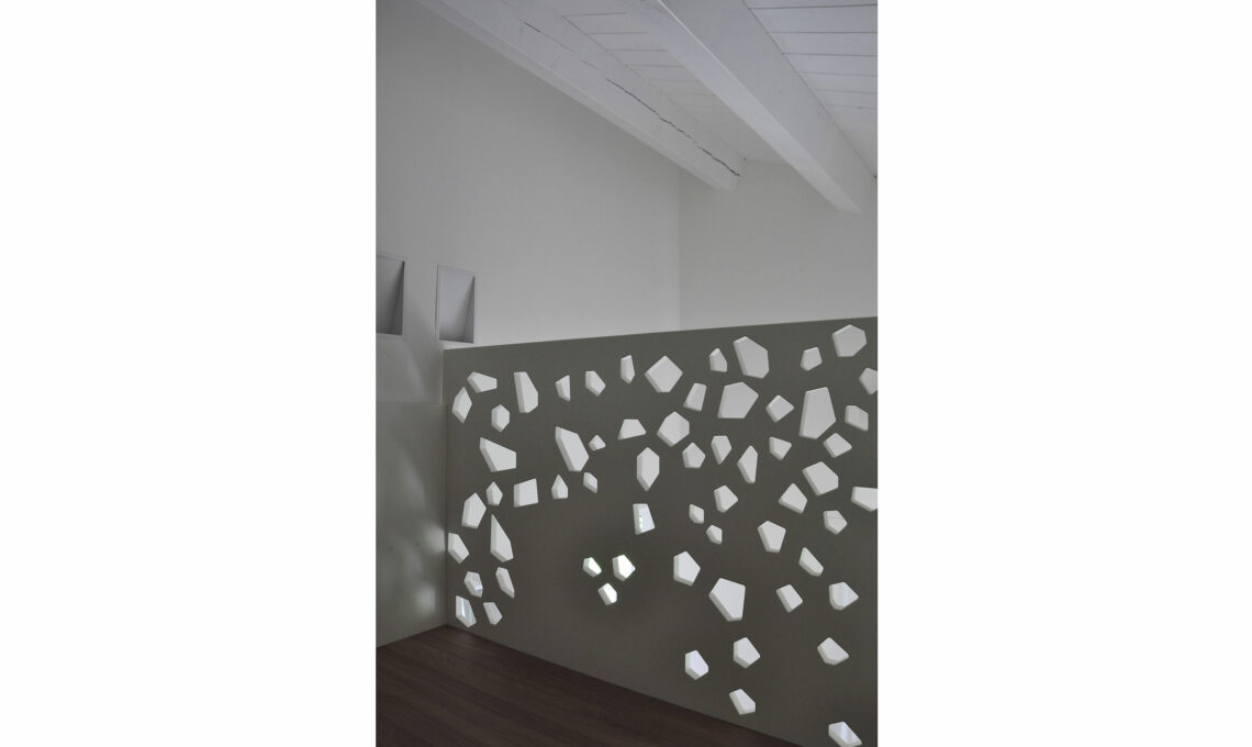 Il gioco compositivo è dato dal disegno del parapetto, in cui la superficie liscia bianca è scavata da poligoni irregolari che proiettano un gioco di ombre sulla parete, e dall’alternanza di pieni e vuoti della libreria sotto la scala.