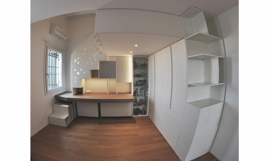 Sotto al soppalco si trovano libreria con scrivania ed armadio, mentre sul soppalco è stato inserito il letto: questa organizzazione ha trasformato lo spazio a disposizione. La struttura, interamente realizzata in legno dalla falegnameria Xilema snc di Villafraca Padovana, integra tutti gli elementi di arredo, evitando ogni spreco di spazio.