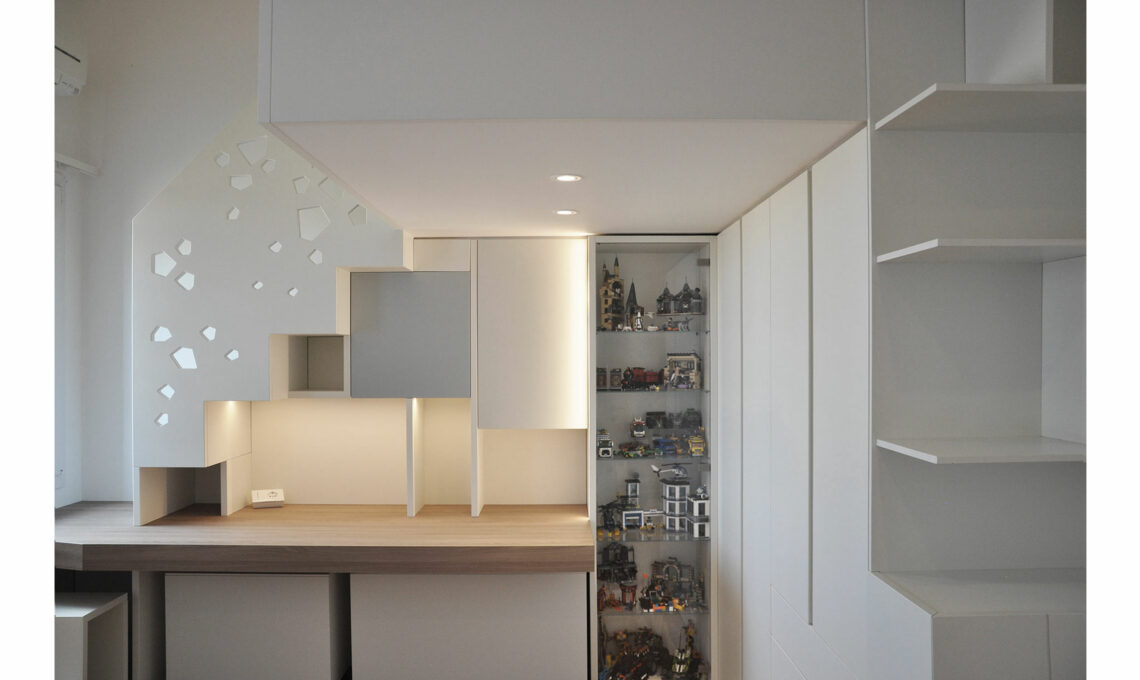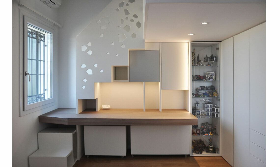 Nel ripensare la camera di uno dei figli dei proprietari la cui necessità era avere un angolo studio più spazioso, ho adottato uno stile coerente con quello già utilizzato nel resto della casa. Da qui la scelta di linee pulite e di una pallette cromatica nordica, con molto bianco accostato a tinte di legno rovere per gli scalini ed il piano scrivania e al dettaglio azzurro polvere per una delle ante della libreria.