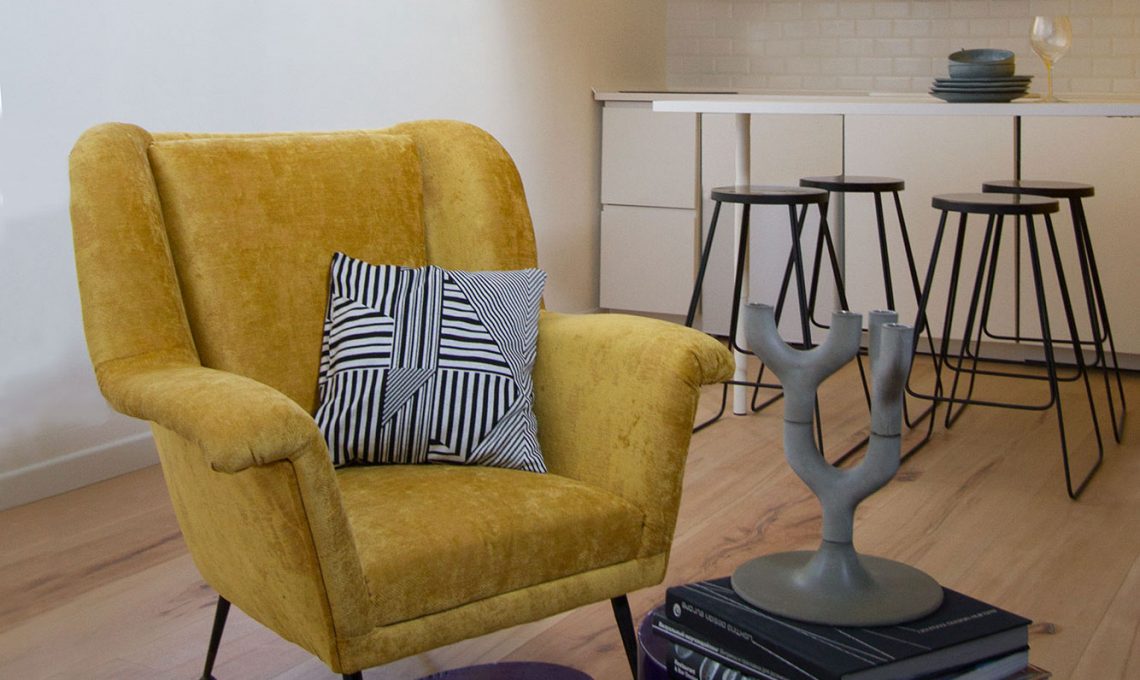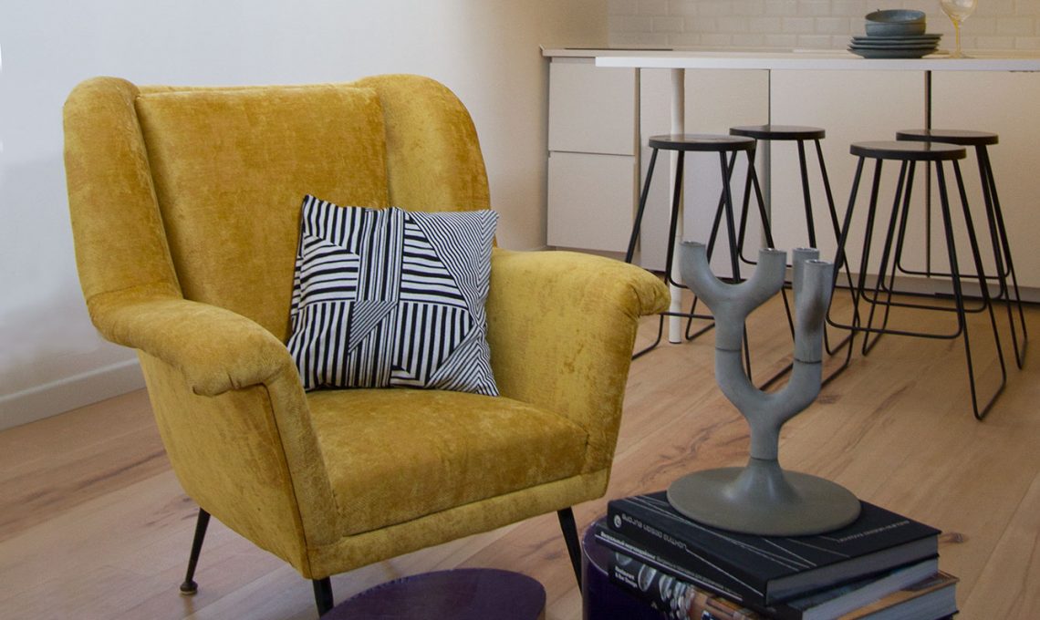 - Però l’anima dell’appartamento è caratterizzata dai dettagli. Per esempio la poltrona gialla vintage e i tavolini viola.