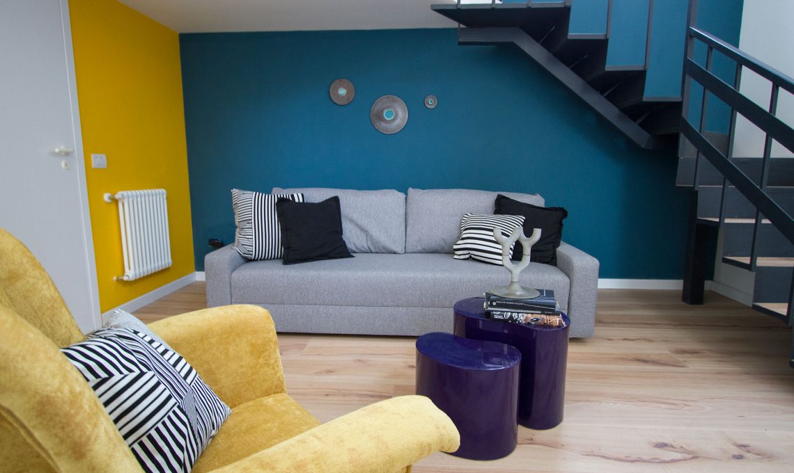 - Il soggiorno è caratterizzato da una parete di colore blu intenso.