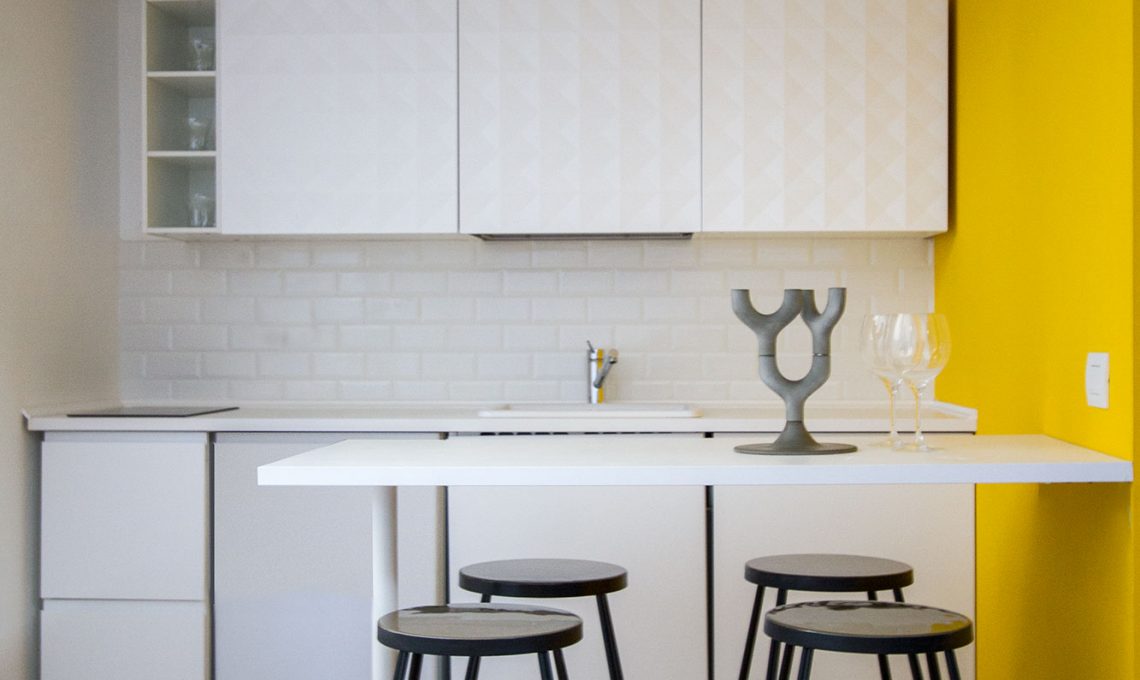 - Avendo i muri dell’appartamento colori intensi, abbiamo deciso bilanciarli con il bianco, colore neutro, della cucina.