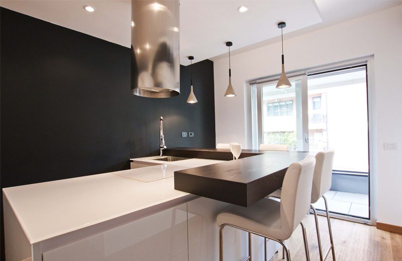 La cucina, fortemente contemporanea, gioca su contrasti di materiali, finiture, spessori, opacità e riflessi: alla parete dal colore totalmente assorbente dato dalla vernice lavagna, si accosta la luminosità del mobile cucina, di un bianco puro, la cui leggerezza e pulizia convive con un piano snack in legno di forte spessore e personalità, illuminato da tre sospensioni Aplomb di Foscarini in cemento grezzo. In conclusione, un loft che nella sua anima virile e materica dichiara una precisione funzionale senza rinunciare a ricreare spazi dedicati al comfort e alla socialità.
