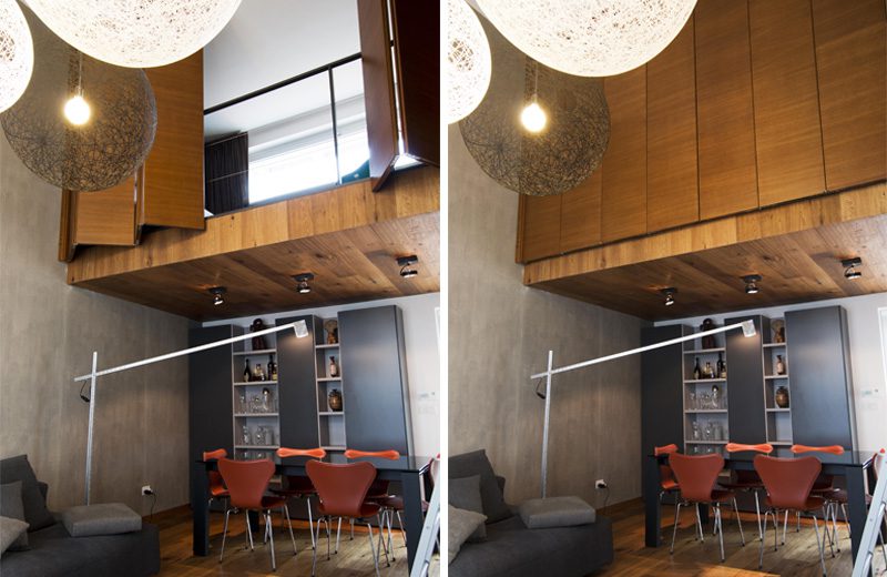 L'area centrale della casa, dominata da un' imponente libreria nera a tutta altezza, si articola in una zona living/dining al piano terra, e, ospitato sul soppalco, uno studiolo, che all'occorrenza si può trasformare in una stanza per gli ospiti. L' isolamento di questo spazio dalla zona più vitale del loft è garantito da un sistema si ante in legno che, scorrendo precise lungo l'intradosso del soppalco, concorrono a creare una continuità con il rivestimento in legno dello stesso.