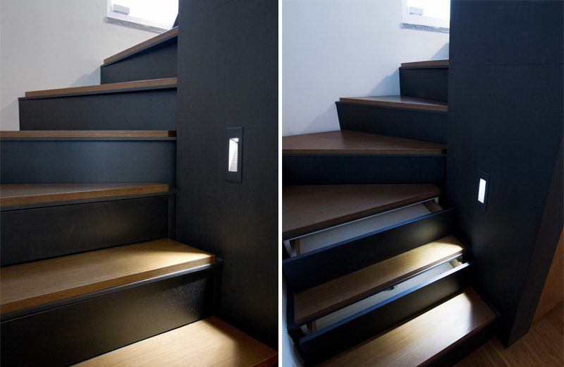 La scala che collega i due piani, anch'essa su misura, riesce ad integrare nella pulizia della sua linea uno spazio destinato ad accogliere e nascondere la lavatrice, e, all'interno dei singoli gradini, degli ulteriori spazi di contenimento.