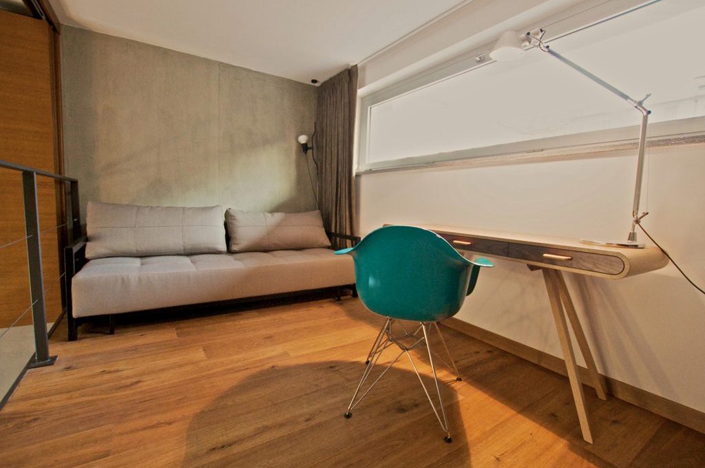 Lo studiolo illuminato da lampade importanti quali la Parentesi di Flos e una mini Tolomeo da tavolo posta su una scrivania Made.com, integra discretamente le sue due funzioni, grazie anche alla scelta di un divano letto che una volta chiuso, non dichiara la sua doppia natura.