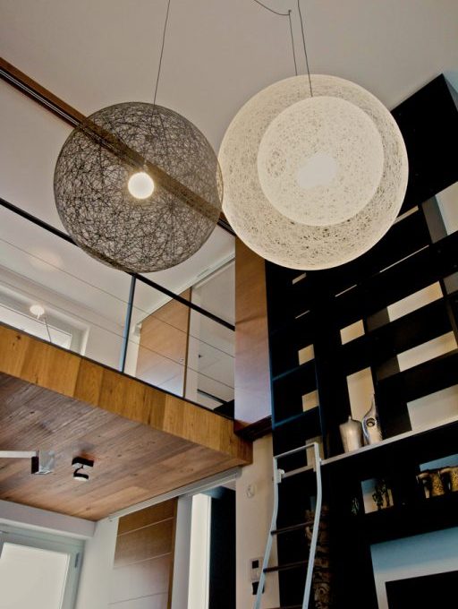 La continuità tra i due livelli è evidenziata, oltre che dalla già citata libreria, da 3 leggere Random lights di MOOOI che dialogano perfettamente con la Tolomeo di Atermide posta ad illuminare il divano, creando un richiamo cromatico con il gioco di trasparenze e contrasti delle tende su misura a tutta altezza.