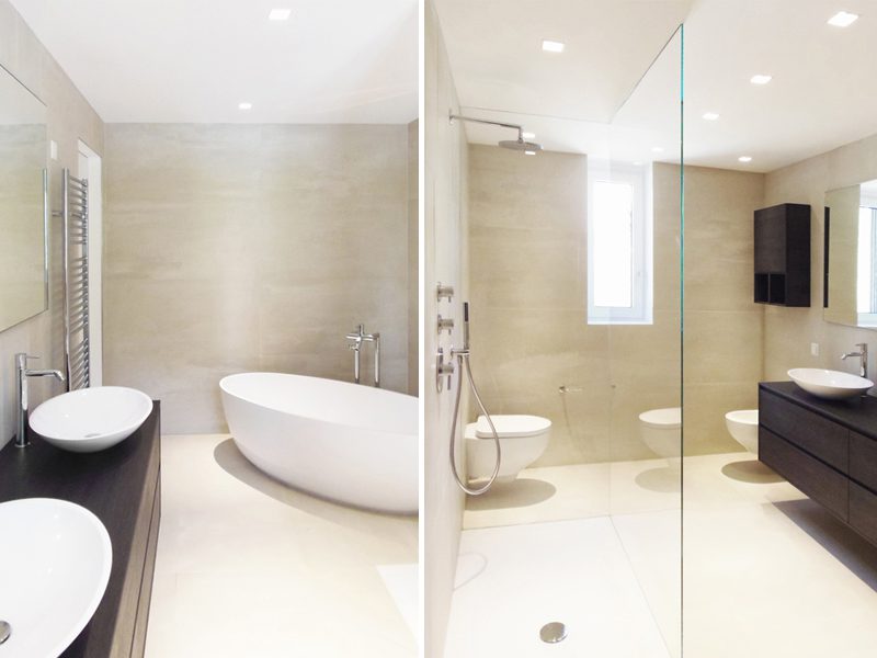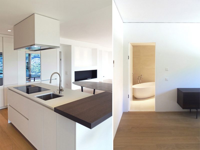 L’appartamento si connota di zona notte e zona giorno nettamente divise. La zona giorno si apre su un grande soggiorno, comunicante con la zona pranzo e con la cucina a vista.