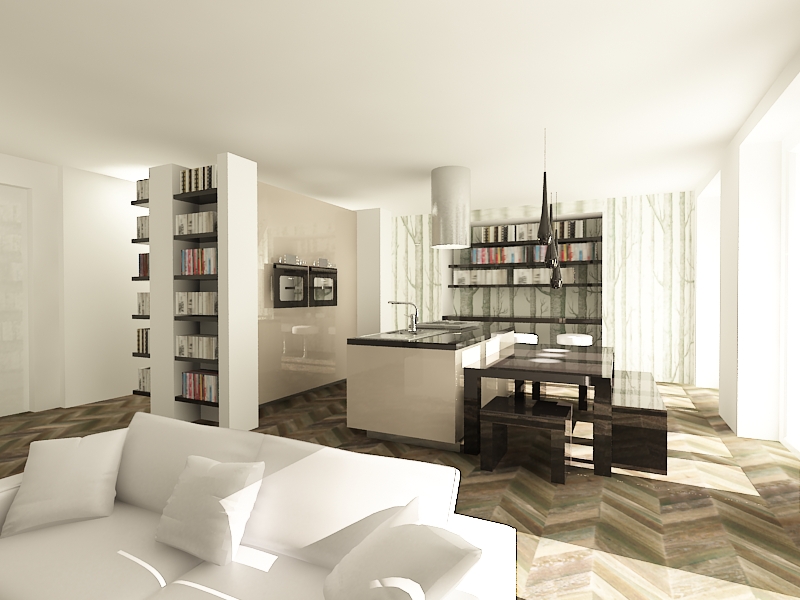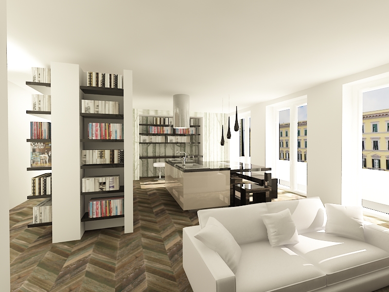 La nuova distribuzione degli spazi è finalizzata a rendere più funzionali gli ambienti della casa separando completamente la zona notte dalla zona giorno.La zona giorno si svilupperà all’interno del grande ambiente che affaccia sul terrazzo posto a sud. Al suo interno sarà presente, oltre alla cucina, anche la zona relax, con divani e mobile tv, e la zona studio, caratterizzata da un ampio piano di studio con diverse mensole sovrastanti su cui disporre i libri. Per il fatto che la cucina e soggiorno siano prospicienti alla porta di ingresso sarà indispensabile prevedere un elemento di separazione che abbia la funzione di schermare la zona giorno dall’ingresso e viceversa.