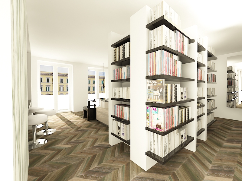 Nello specifico si propone di realizzare una libreria a “C” utilizzando i due pilastri già esistenti nel soggiorno.