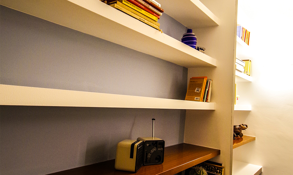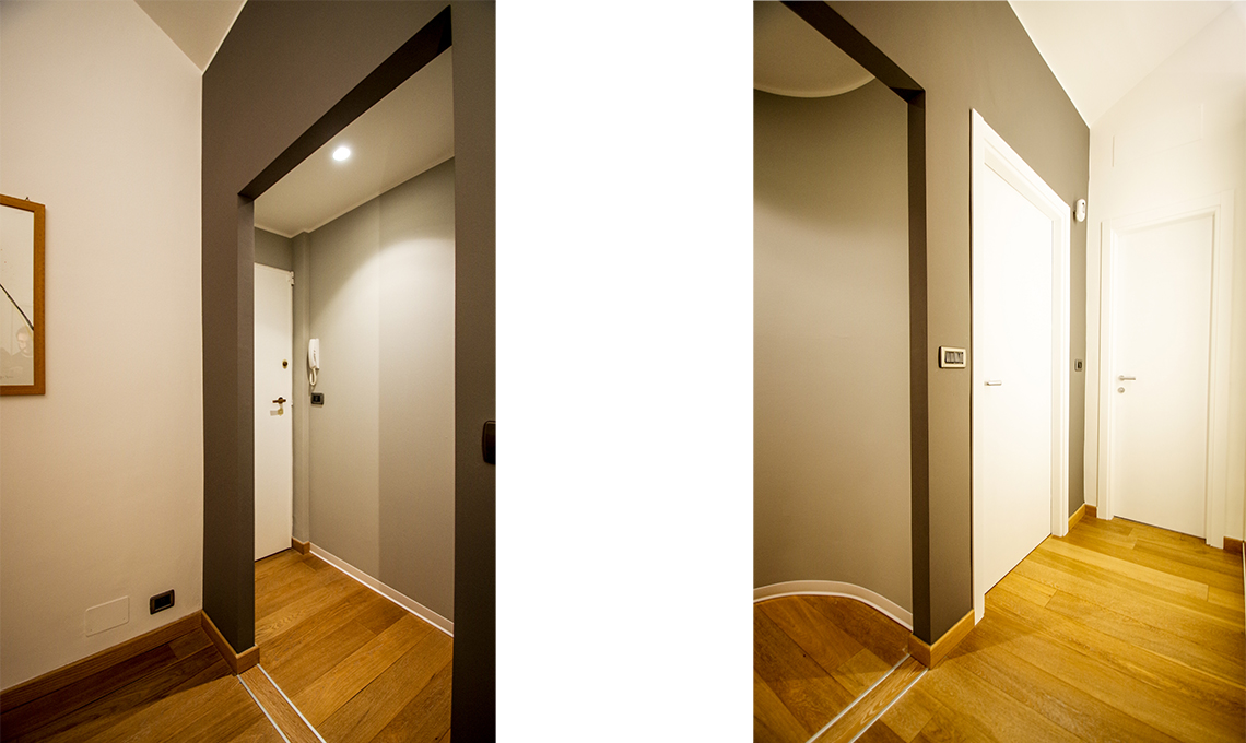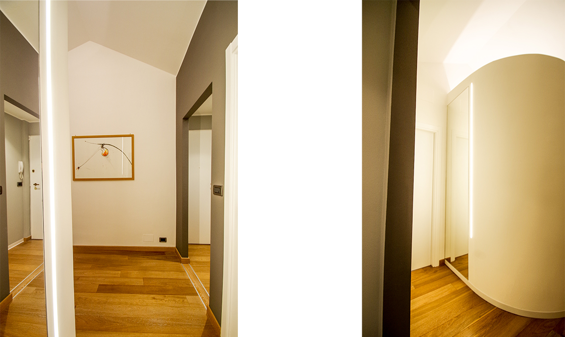 Il progetto ha previsto una struttura in cartongesso che isolasse la scala a chiocciola che porta al piano di sotto, la creazione di un ingressino per l'accesso dal vano scala condominiale e la creazione di una cabina armadio con accesso dal bagno. Il restyling ha giocato con i colori (due tonalità di grigio e l'azzurro balena), con le luci (ci siamo divertiti ad usare lame di luce verticale), con gli specchi (per dilatare lo spazio laddove serviva) e con la progettazione di una libreria in cartongesso e legno.