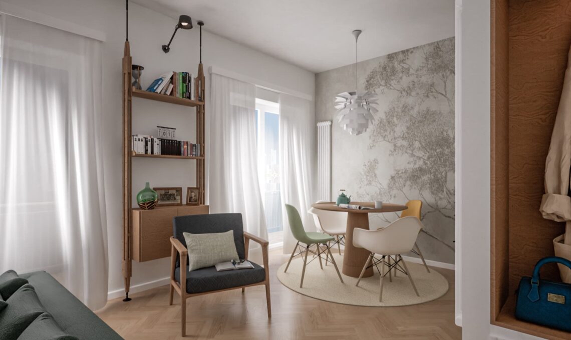 Il progetto ha eliminato una delle due porte di ingresso ed ha unito due ambienti per creare un unico spazio fluido , un open space con funzioni diverse: ingresso, living, zona relax, pranzo.