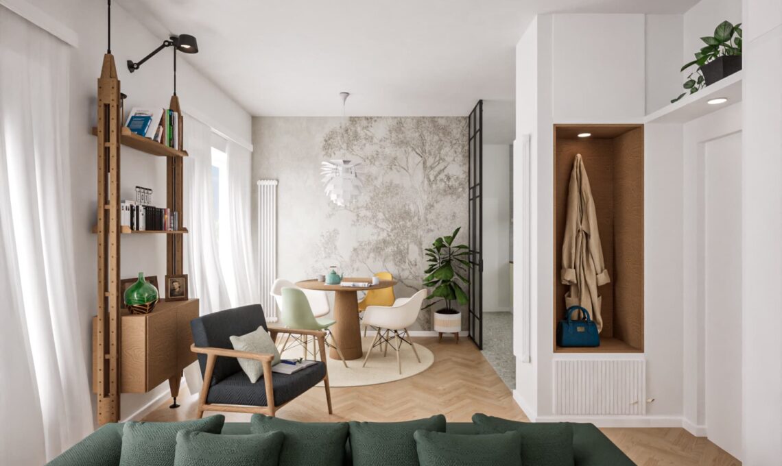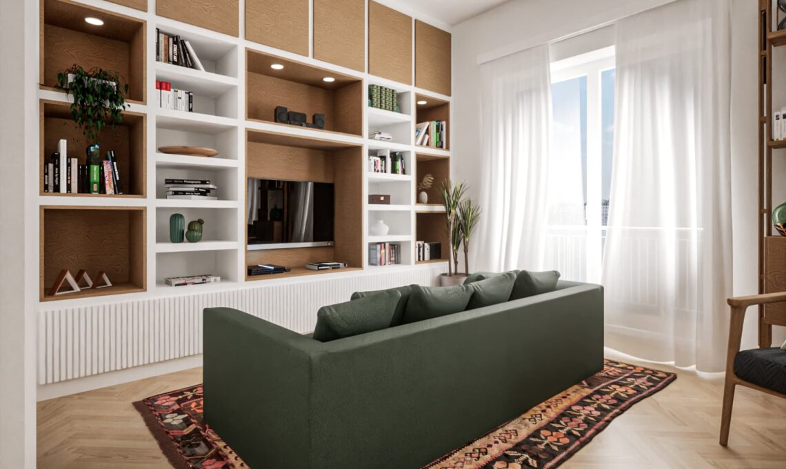 Lo spazio del living è delimitato da mobili su misura che fungono da cappottiera e librerie, oltre ad avere uno spazio per l'home office a scomparsa.