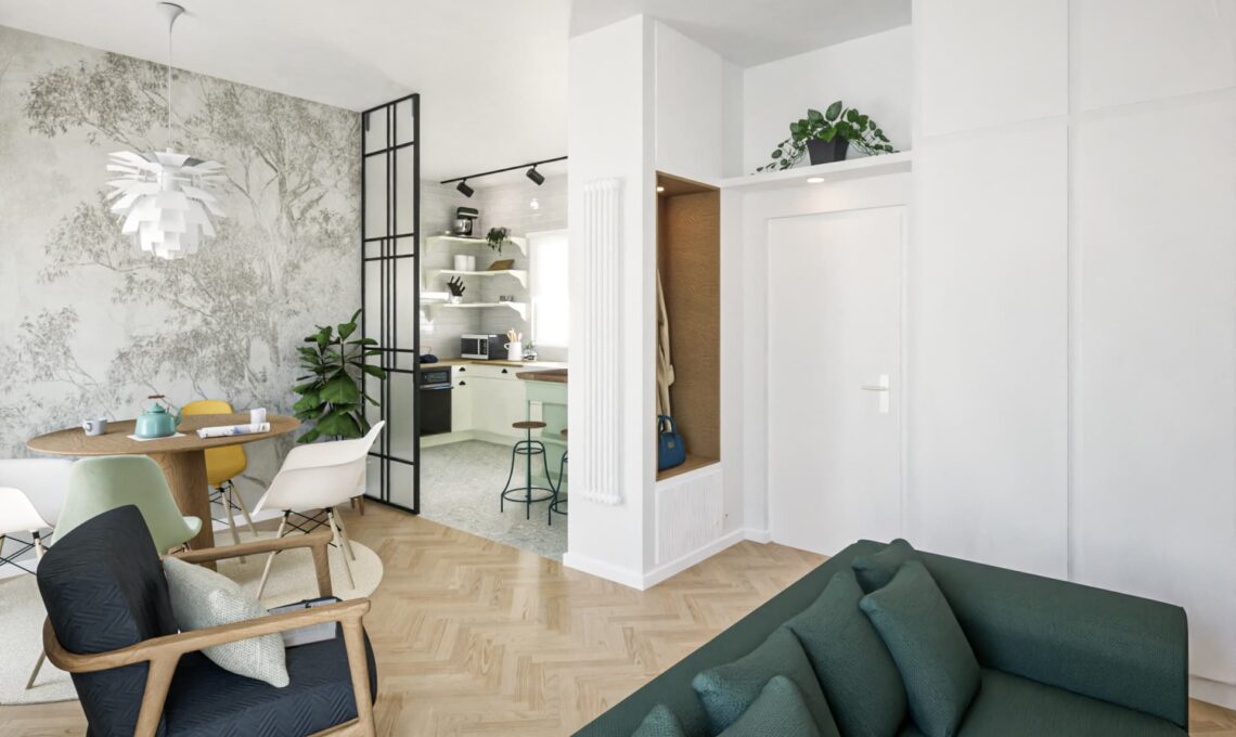 Gli spazi in se' non sono molto ampi, ma la scelta dei materiali e delle finiture giuste fa percepire tutto più profondo e spazioso. Un esempio è la carta da parati Rimura Ophelia, che rende evanescente la parete di fondo, facendola quasi scomparire.