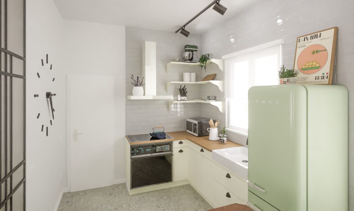 Su questo, avendo eliminato il corridoio, si apre la cucina, piccola ma funzionale e luminosa, grazie anche all'apertura di due nuove finestre.