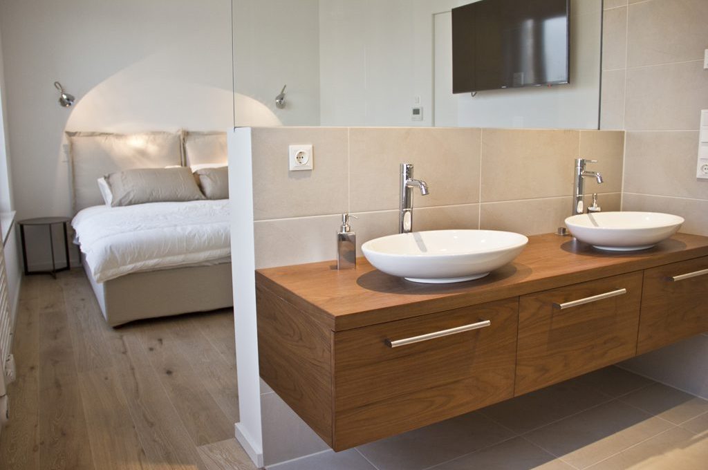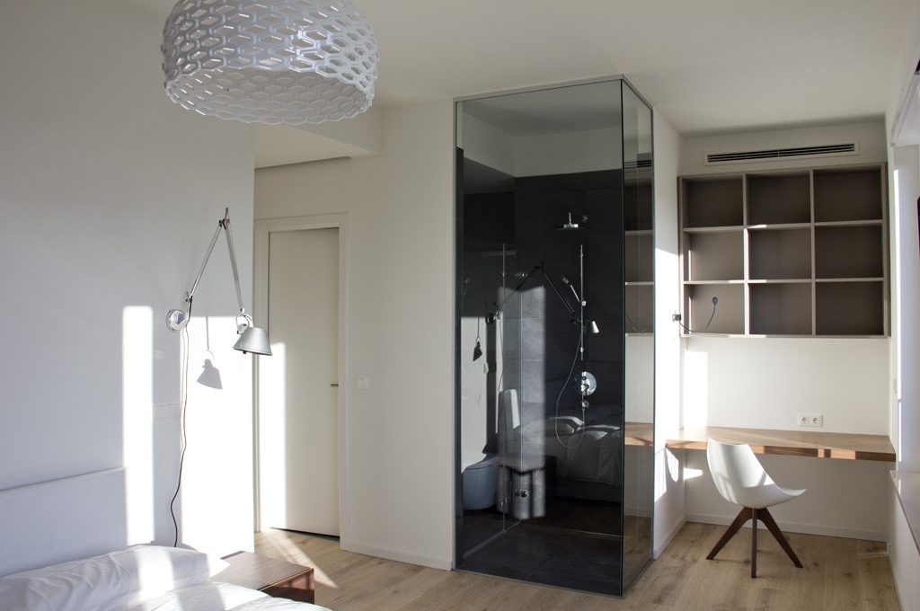 Anche la seconda camera da letto ha un bagno interno. Questo si apre sulla camera da letto, le pareti della doccia infatti sono vetrate ed i due ambienti comunicano visivamente l’uno con l’altro. Una zona studiolo è stata inserita nella seconda camera da letto.