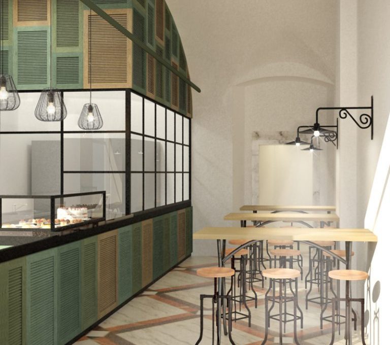 Progetto di del concept di un locale di focacce a Genova, gli elementi architettonici Genovesi diventano elementi fondamentale.