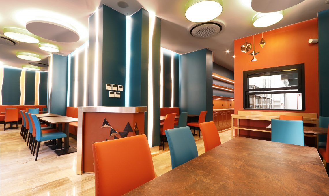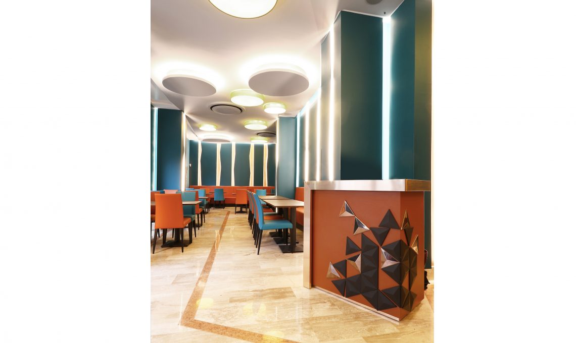 I tavolini, con piano effetto rame, sono stati abbinati a sedute in pelle petrolio e arancione, sapientemente alternate per conferire dinamismo all'ambiente.