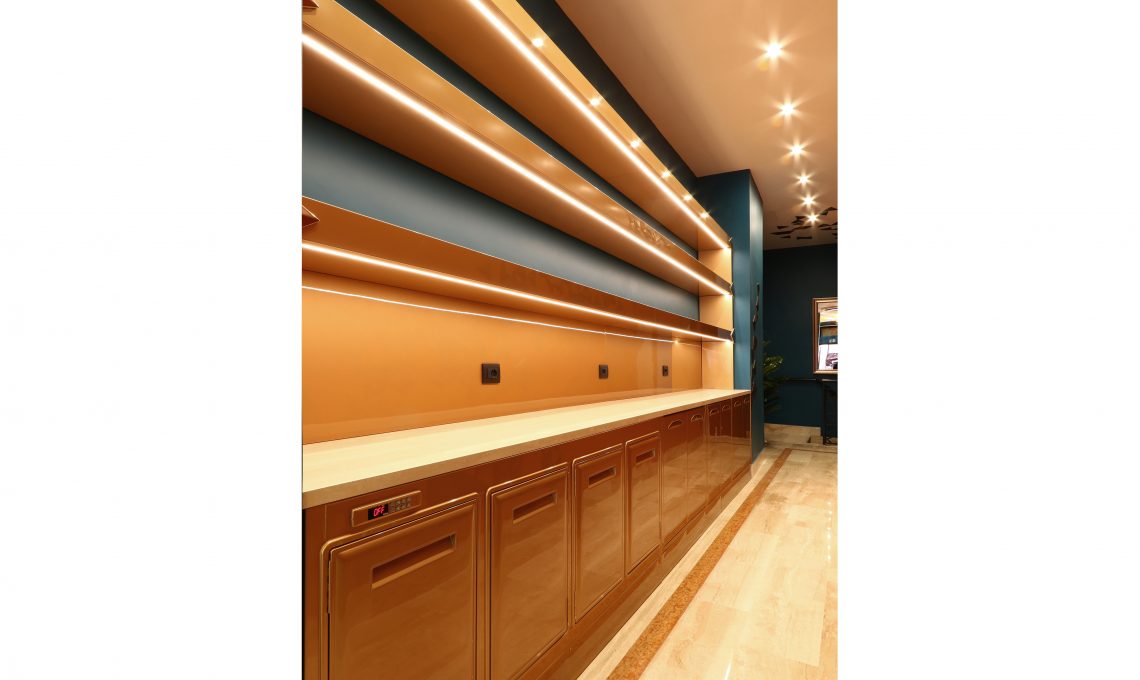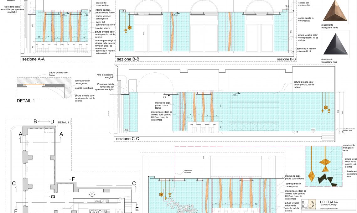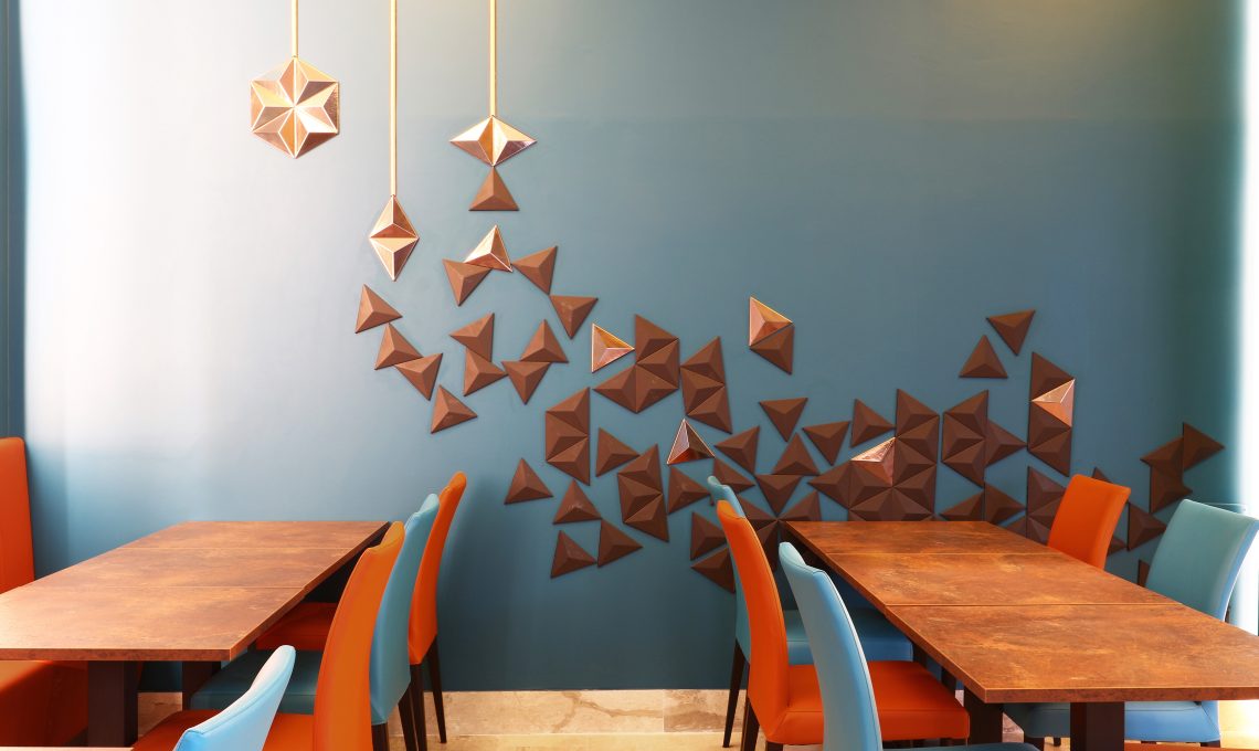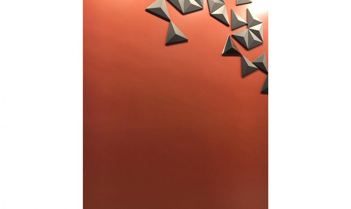 Tuttavia, sentivamo che mancava ancora qualcosa….Abbiamo quindi selezionato delle mattonelle 3D a forma piramidale e le abbiamo applicate una ad una in modo strategico e calibrato per decorare i corridoi, il bancone della cassa e le pareti laddove sentivamo che mancava qualcosa.
