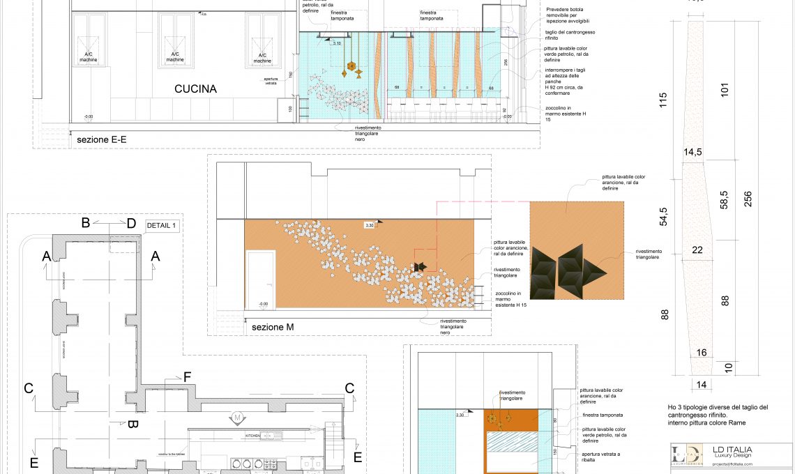 Il committente desiderava un ristorante che incarnasse l'essenza dell'India, ma che allo stesso tempo riflettesse lo stile italiano e romano del contesto in cui sarebbe sorto: un compito tutt'altro che semplice! Abbiamo quindi abbandonato i cliché tipici dei ristoranti indiani e optato per un approccio più audace. Abbiamo scelto due colori vivaci, ispirati alle spezie e ai sontuosi abiti di seta indossati spesso dai nostri committenti: il petrolio e l'arancione, questi colori sono diventati il leitmotiv del nostro progetto. Il pavimento in travertino originale si fonde con il rame impiegato alle pareti, nel bancone bar e nella cassa, abbiamo poi realizzato intere pareti con smalto murale color petrolio, arricchite da squarci irregolari, retroilluminati e rivestiti di rame, realizzando così scenografiche quinte per la sala.