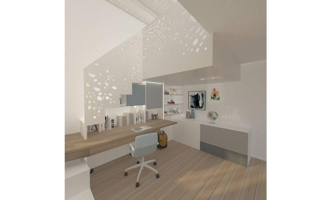 Il progetto di interni per questa camera con studio risponde alla necessità di aumentare la superficie a disposizione, sfruttando l’altezza del tetto in legno inclinato con l’inserimento di un soppalco, e alla voglia di creare uno spazio fortemente personalizzato con una soluzione dal design leggero ma di grande impatto.