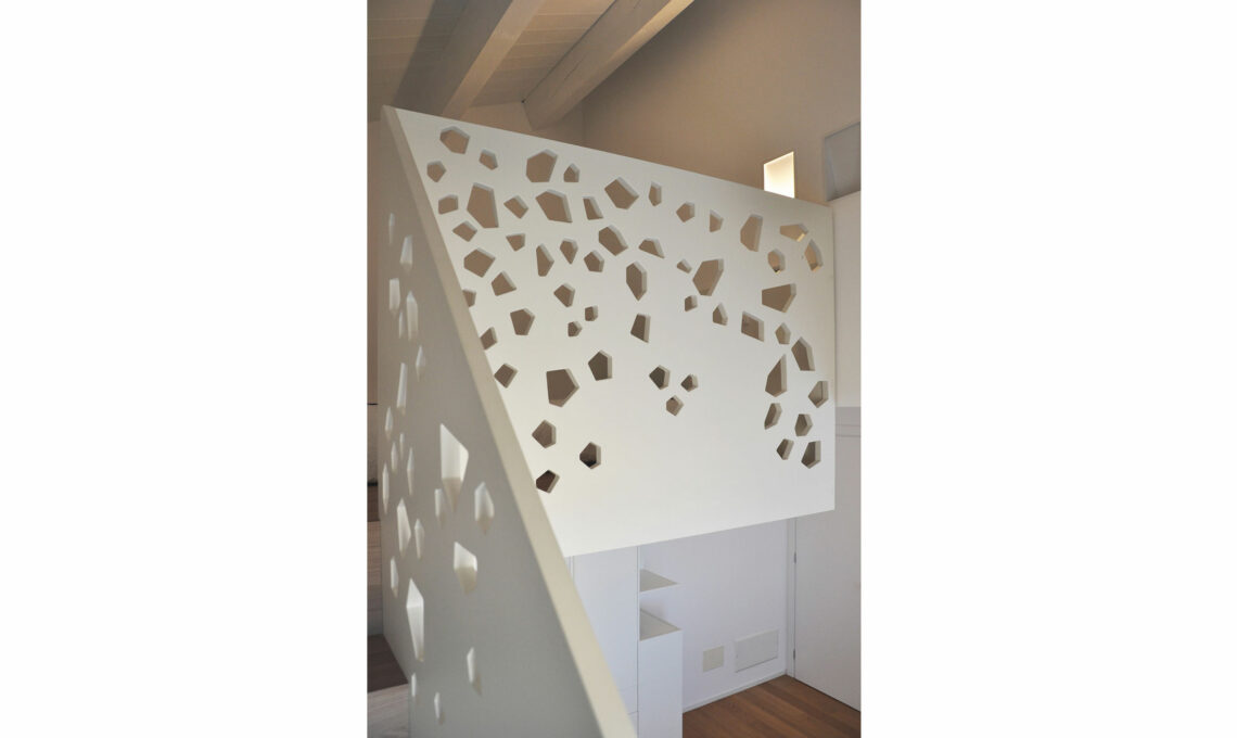 - Il gioco compositivo è dato dal disegno del parapetto, in cui la superficie liscia bianca è scavata da poligoni irregolari che proiettano un gioco di ombre sulla parete e dall’alternanza di pieni e vuoti della libreria sotto la scala.
