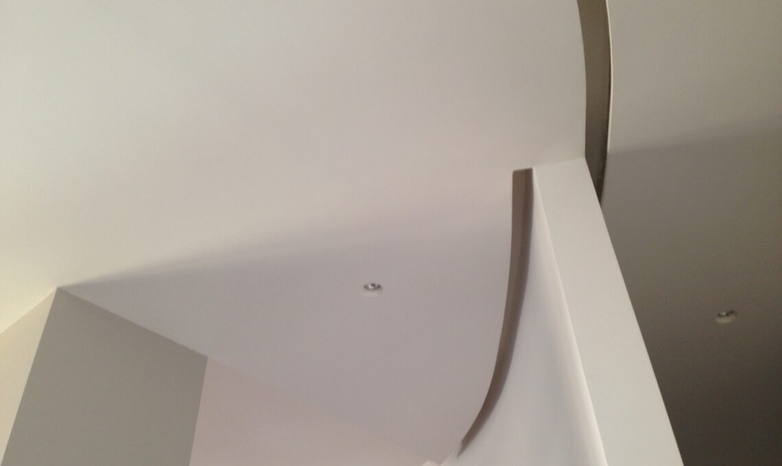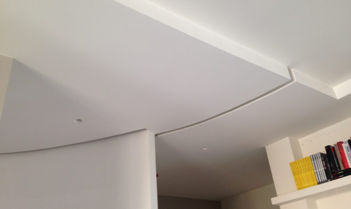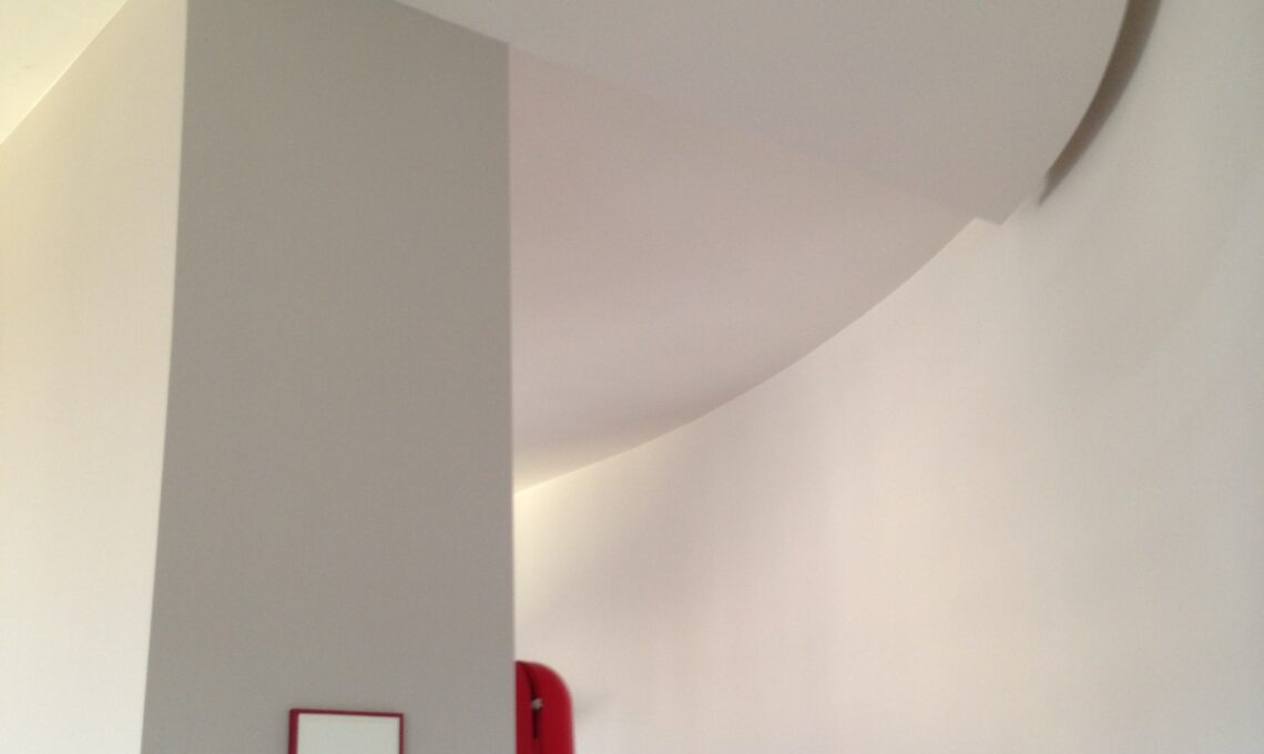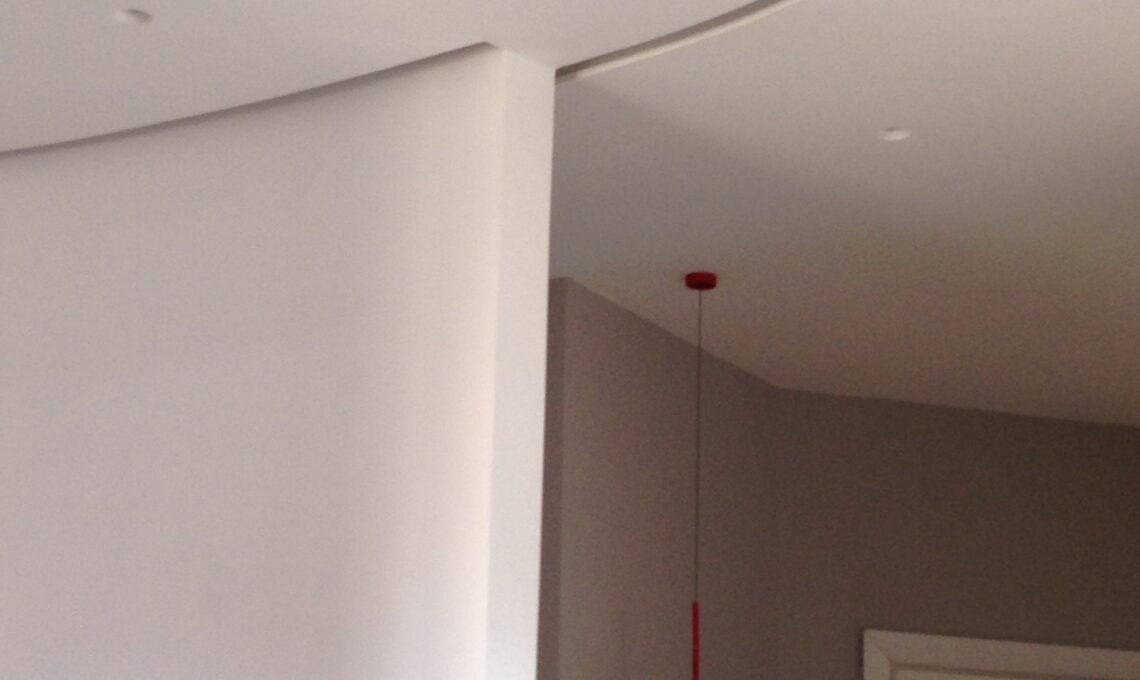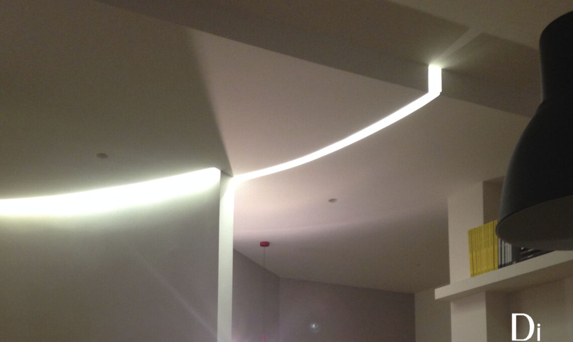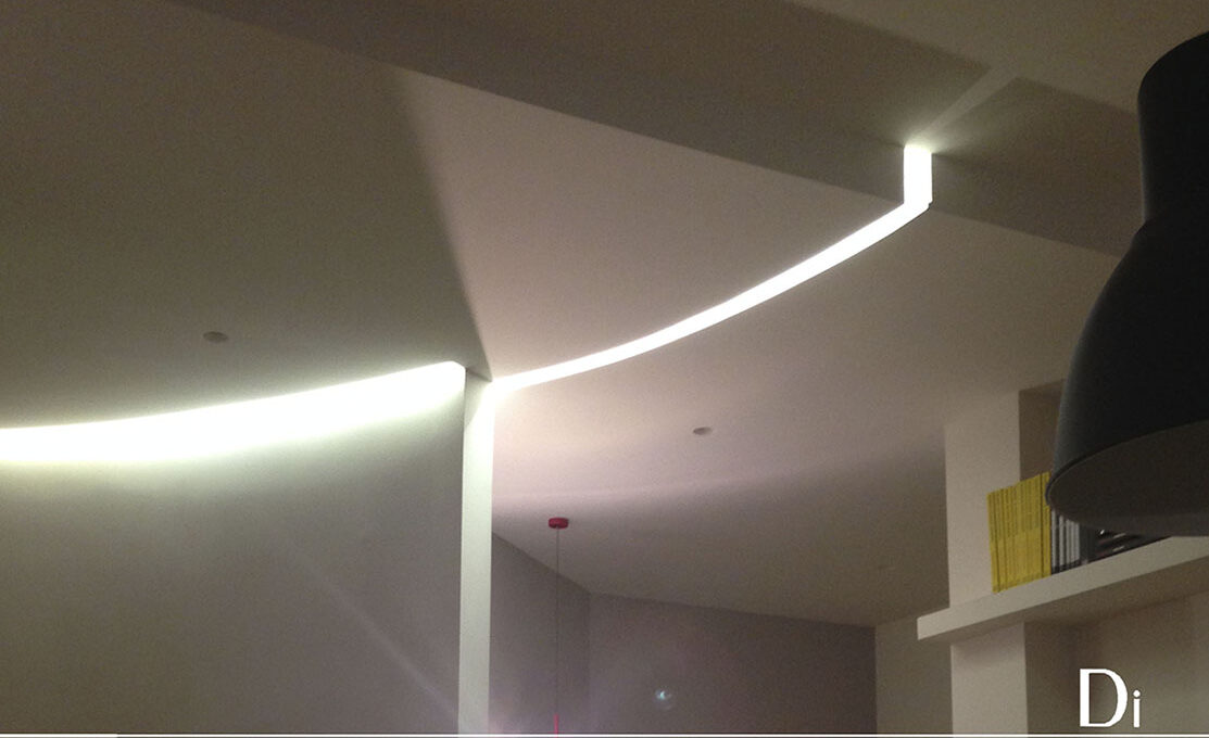La curva si riflette sui soffitti e viene accentuata ed enfatizzata da una linea led di luce, la stessa ne costituisce lil cuore spaziale dell’abitazione.