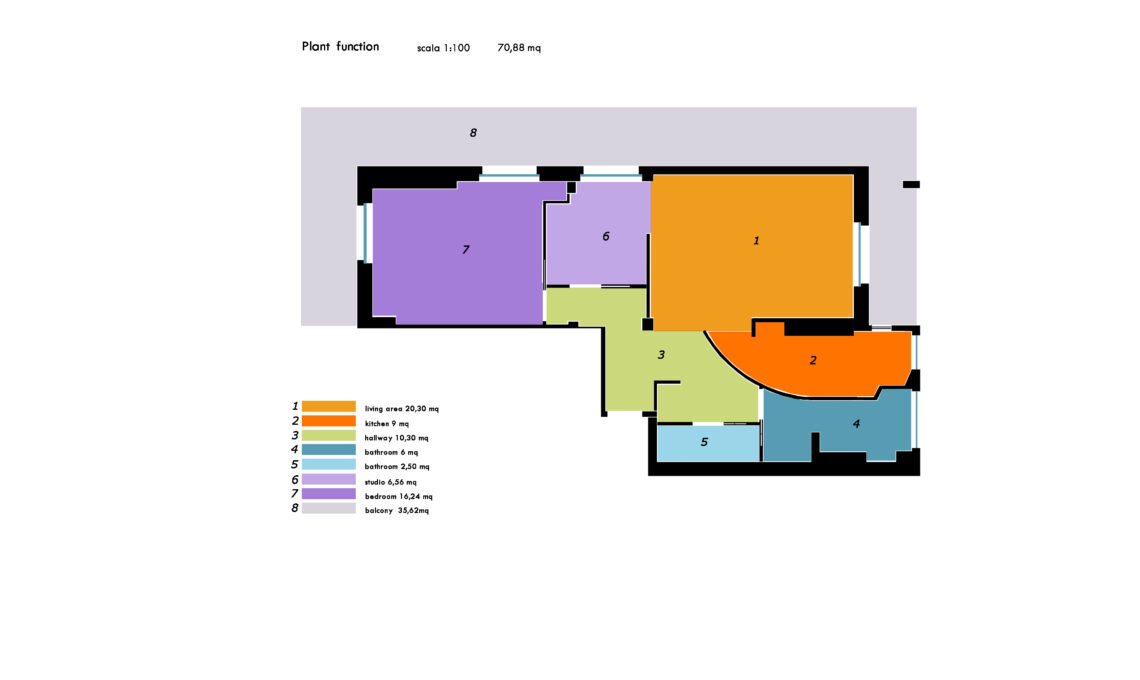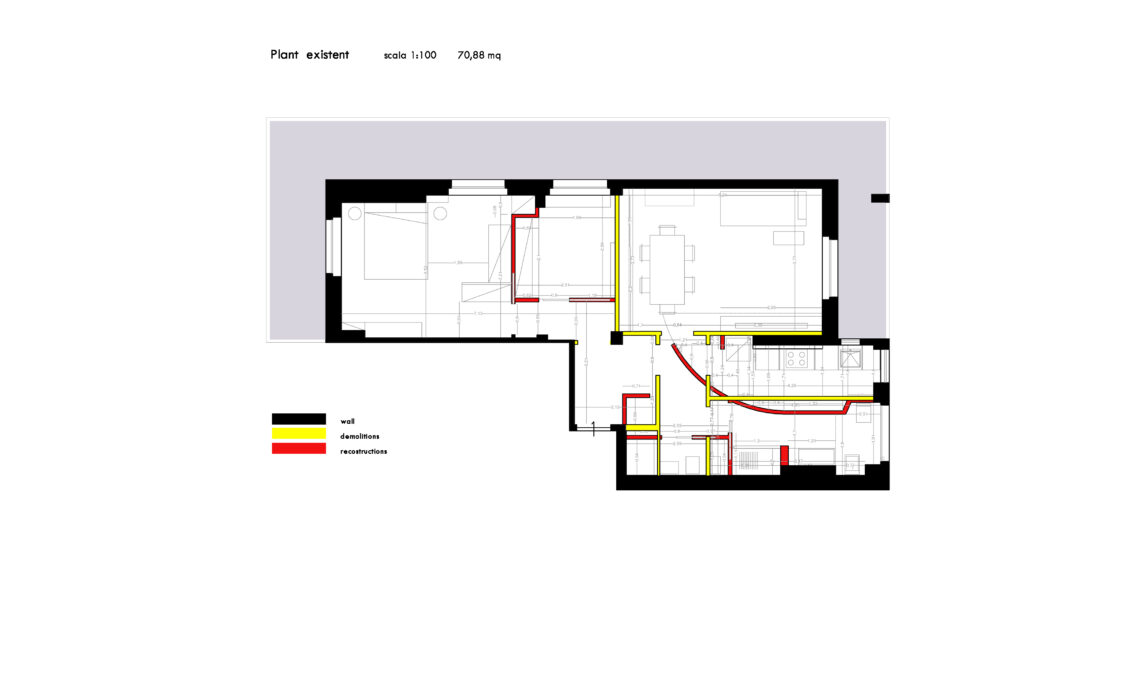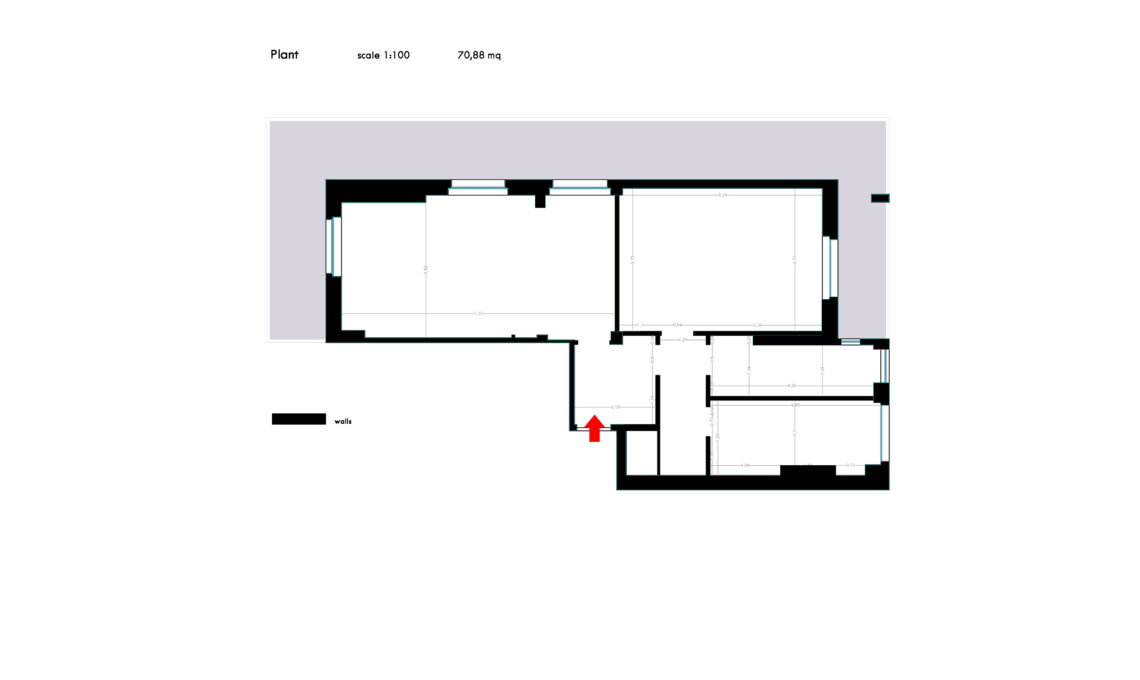 Un appartamento di 70 mq al sesto piano di un edificio degli anni 70’ (sito in via Cappellini- Milano), si configura originariamente come bilocale composto da: salotto, stanza da letto, bagno e cucina con adiacente piccolo ripostiglio.