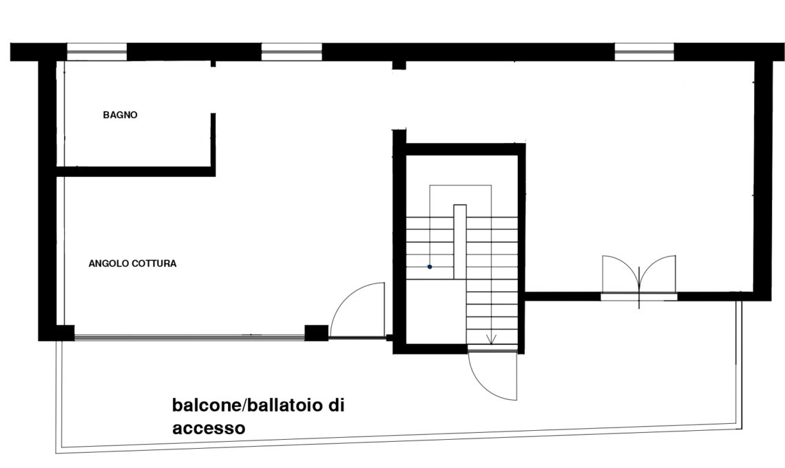 Si tratta di una mansarda all’ultimo piano di un piccolo edificio non proprio al centro della cittadina ma vista mare, grazie ad una grande vetrata (da cui un po’ in lontananza si scorge anche il promontorio della bellissima città storica) ed a una porta finestra che si apre sul balcone. Dalle tre finestre sul lato opposto si scorgono invece le colline dell'entroterra.Planimetria dello stato di fatto prima dei lavori