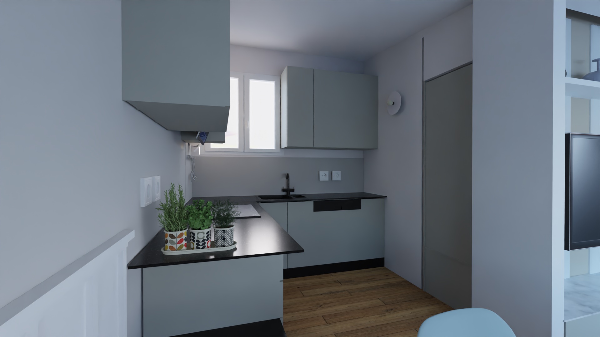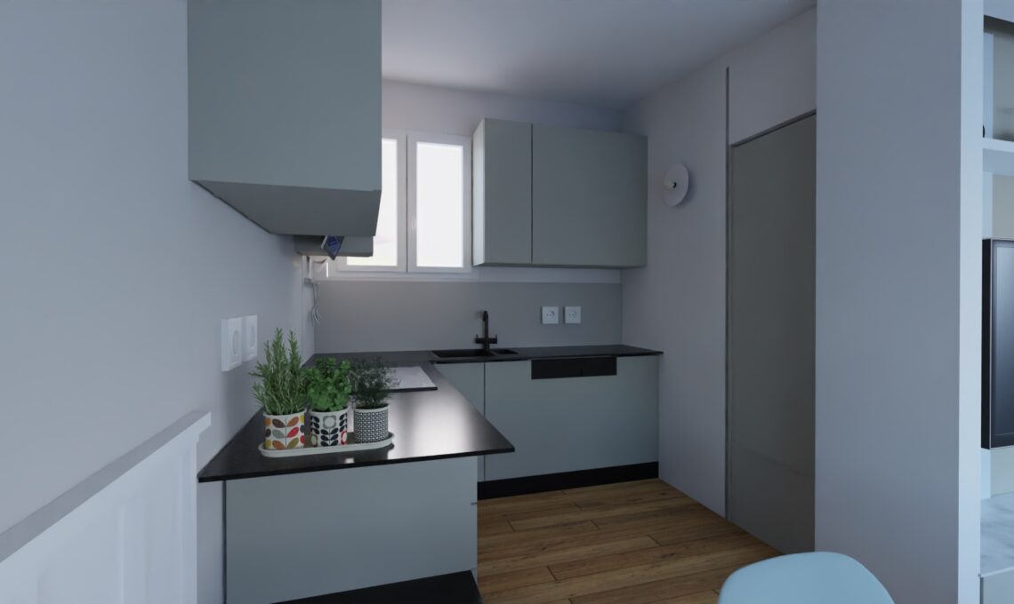 Cucina e bagno sfruttano la luce naturale proveniente dalle due finestre preesistenti.