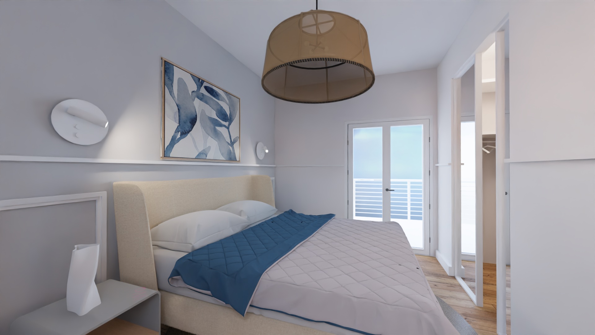 La camera da letto è preceduta da una postazione di home office (l’altra è stata prevista realizzando un piccolo bancone su misura nel living in una posizione privilegiata per la vista sul borgo). In camera ho disegnato una piccola cabina armadio (richiesta specifica della cliente) con le porte a specchio per mitigare visivamente la riduzione di spazio.