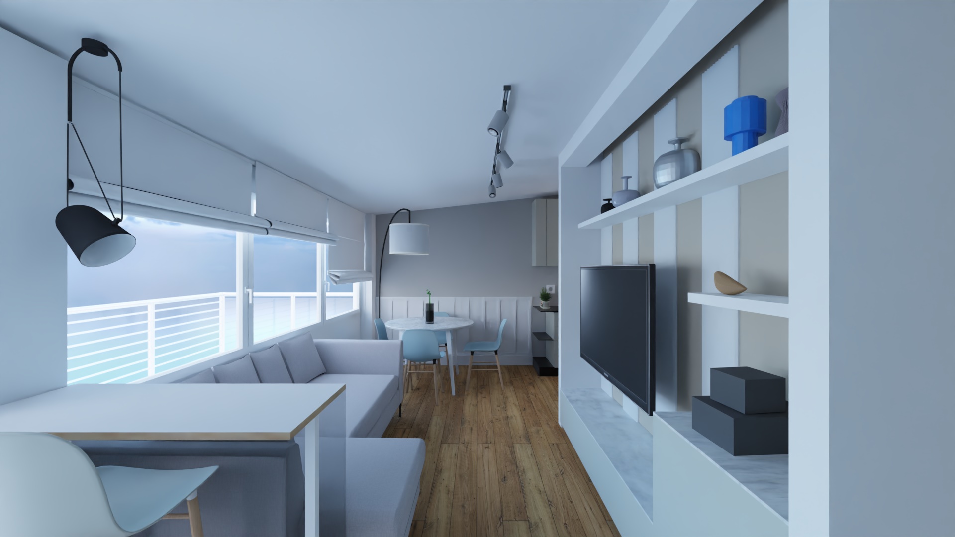 - zona soggiorno: creare uno spazio con tv con il divano davanti, cercare di mascherare l'ingresso della porta del bagno (con un mobile ?), tavolo e sedie adatto anche a cene con amici.