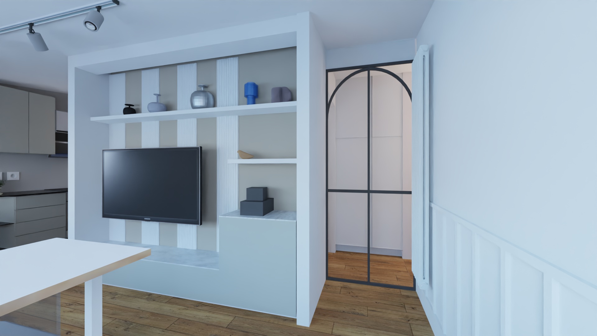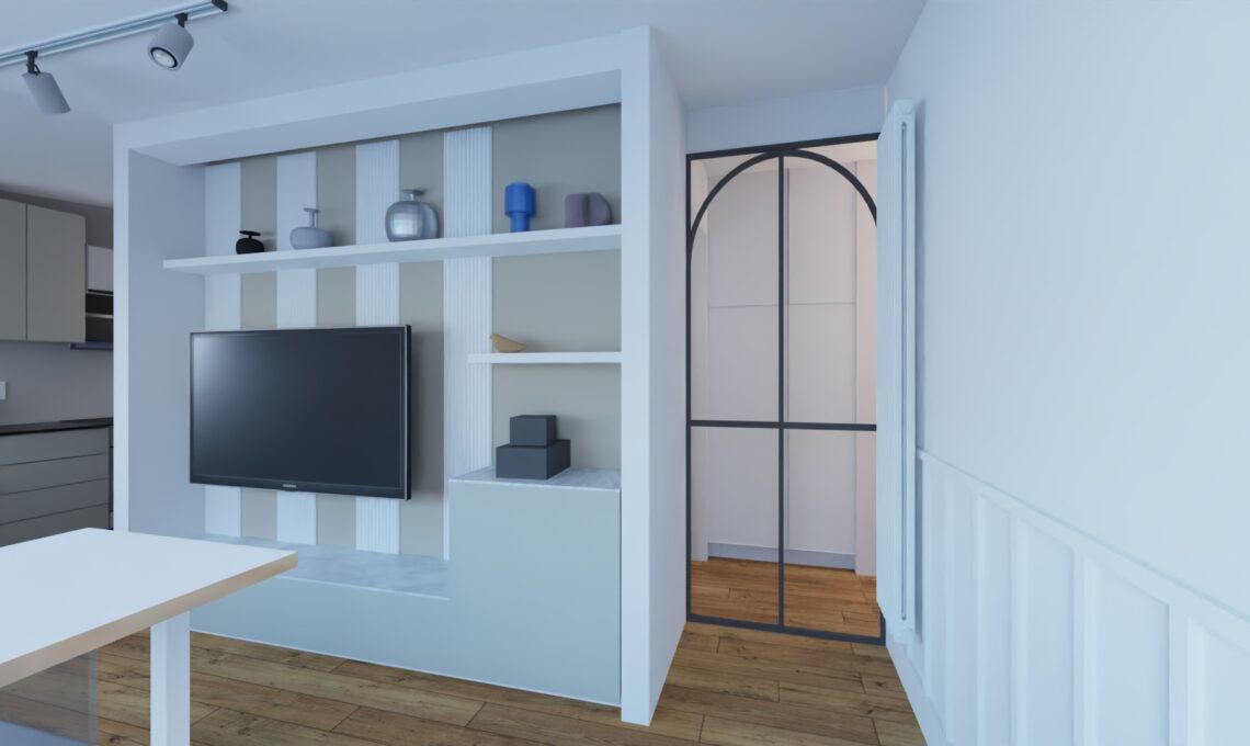 Con un gioco di nicchie ho creato uno spazio per l’incasso sia della doccia nel bagno sia del frigo in cucina. Analogamente nel living ho definito la parete attrezzata per la tv con la realizzazione di due spallette.