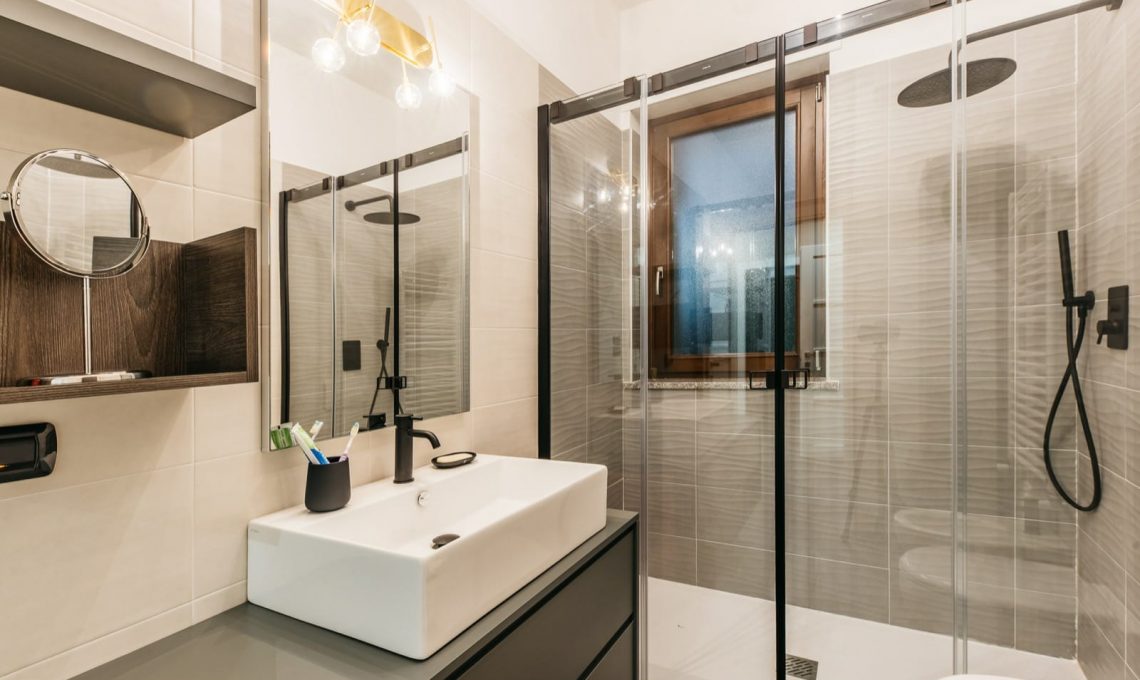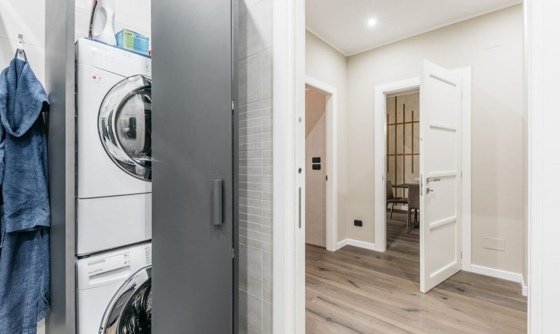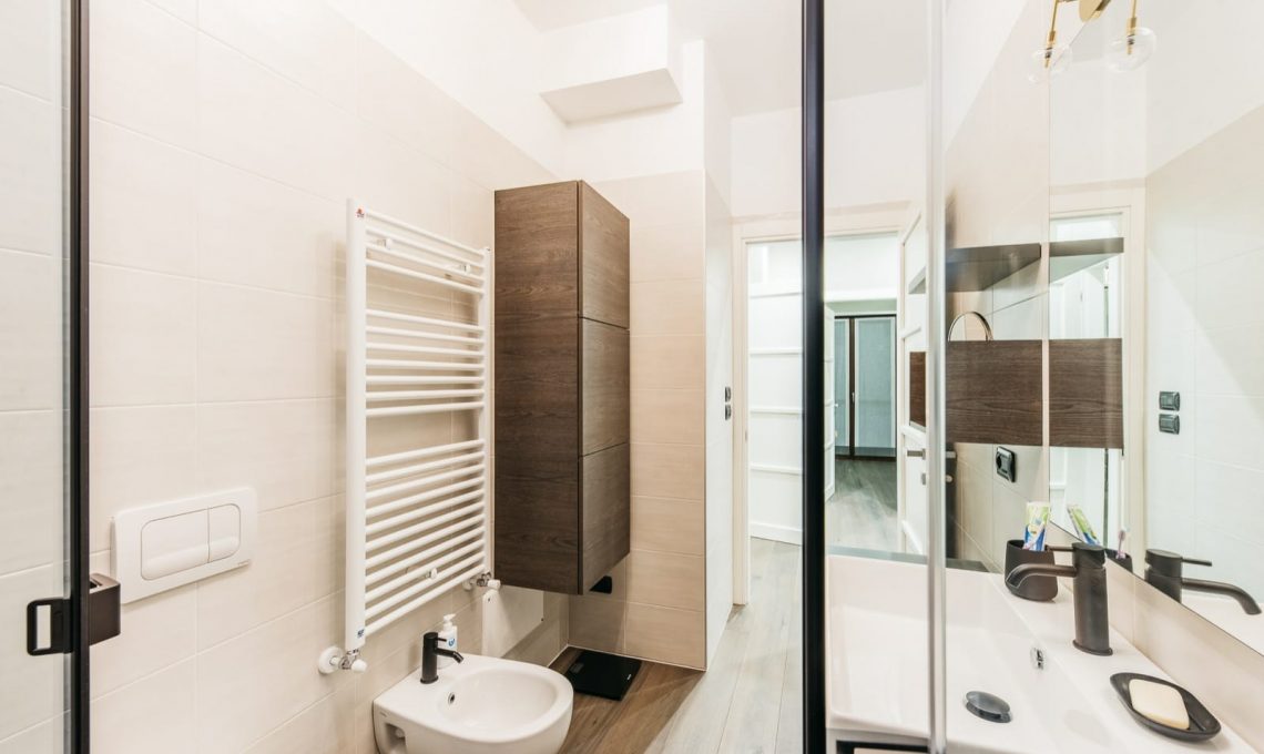 - Per quanto riguarda i due bagni, ho seguito il cliente da vicino nella scelta per l’arredo bagno e le piastrelle. Nel primo, di servizio, abbiamo concentrato l’area lavanderia grazie a un mobile che nasconde gli elettrodomestici; nel bagno padronale la grande doccia, la rubinetteria color nero e i corpi illuminanti si sono rivelati i punti di forza dell’ambiente.