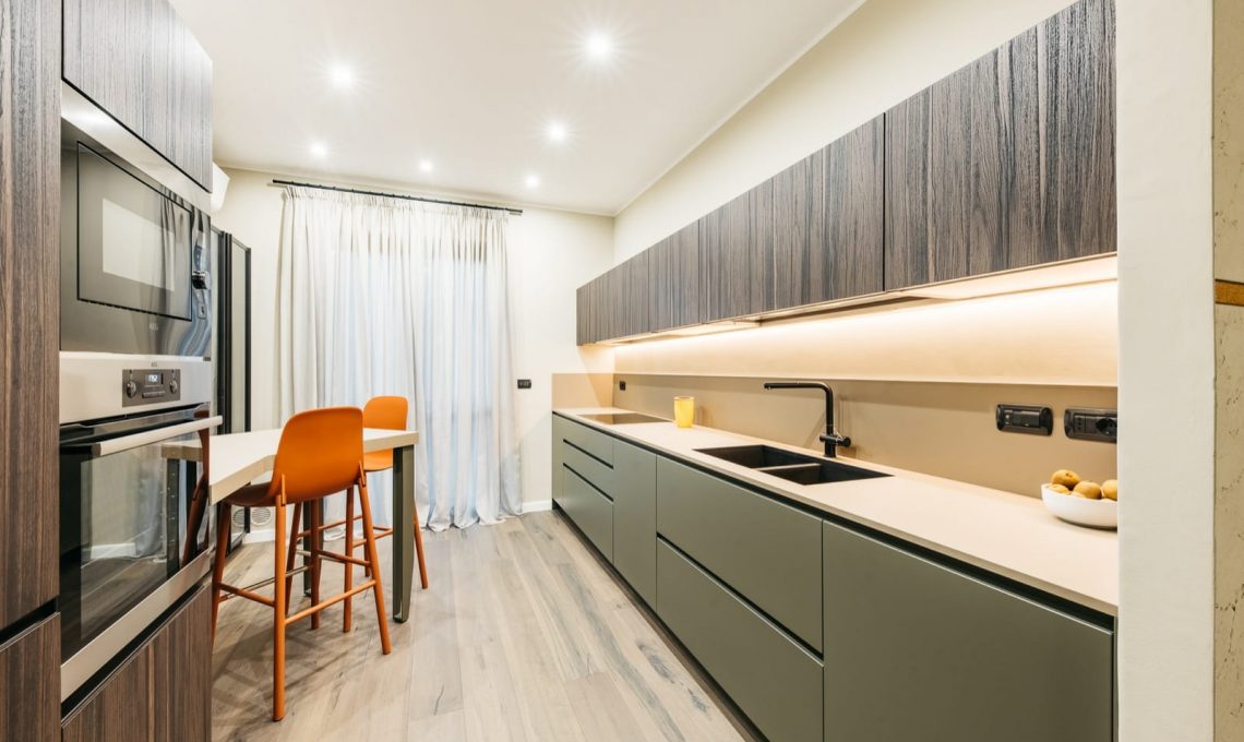 - Ho proseguito i lavori nella zona giorno con una cucina attrezzata su entrambe le pareti, realizzata con Meson’s cucine. Gli sgabelli Sharkdi Kristalia sono veramente comodi e il loro design è impeccabile.