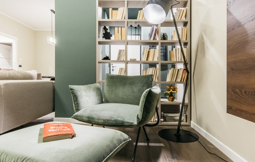 Per l’organizzazione degli spazi abbiamo lavorato sulle esigenze del cliente:- Dal momento che voleva una zona riservata, separata dall'ingresso, ho creato un ambiente salotto e un angolo lettura con la giusta privacy. La libreria passante di Novamobili funge da parete divisoria, fa passare la luce ma allo stesso tempo divide gli spazi. La poltrona Pil di Bonaldo ha dato un ulteriore tocco d’importanza a questo angolo.