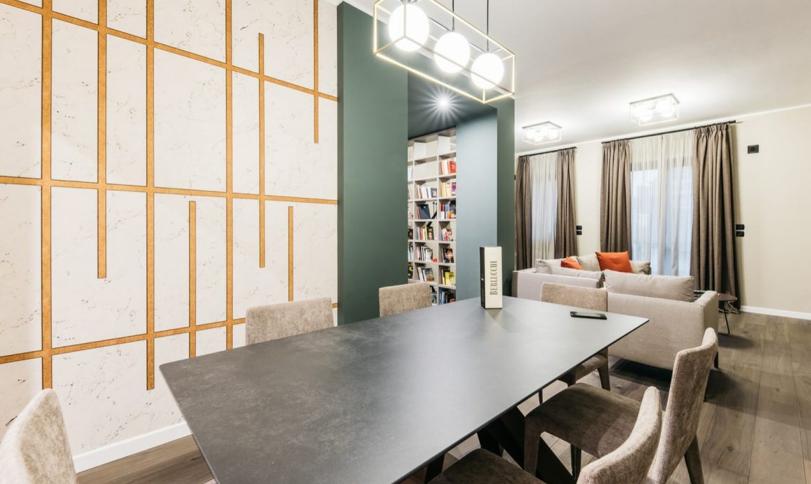 - La sala da pranzo è stata ricavata di fronte all'ingresso della cucina: abbiamo deciso di metterla in risalto grazie a un’elegante carta da parati di London Art abbinata al lampadario di Ideallux.