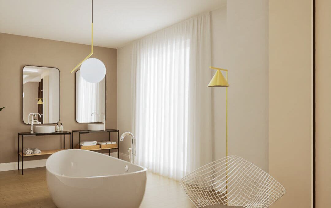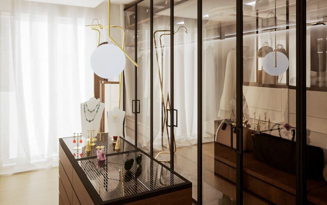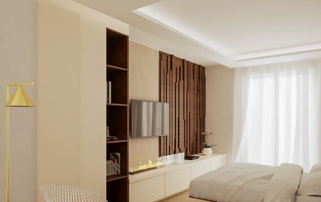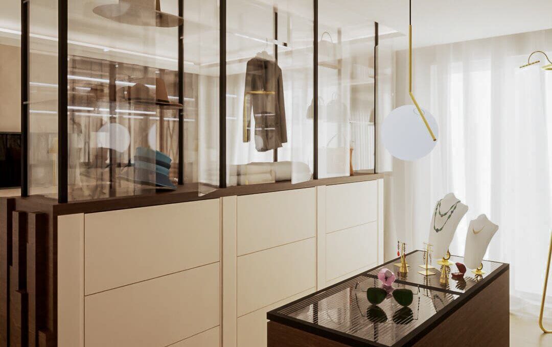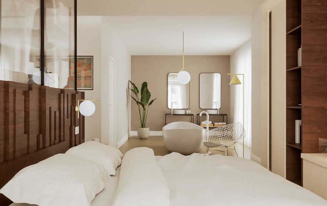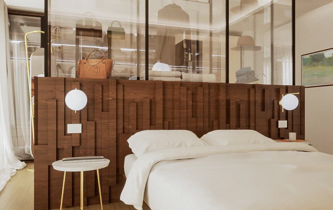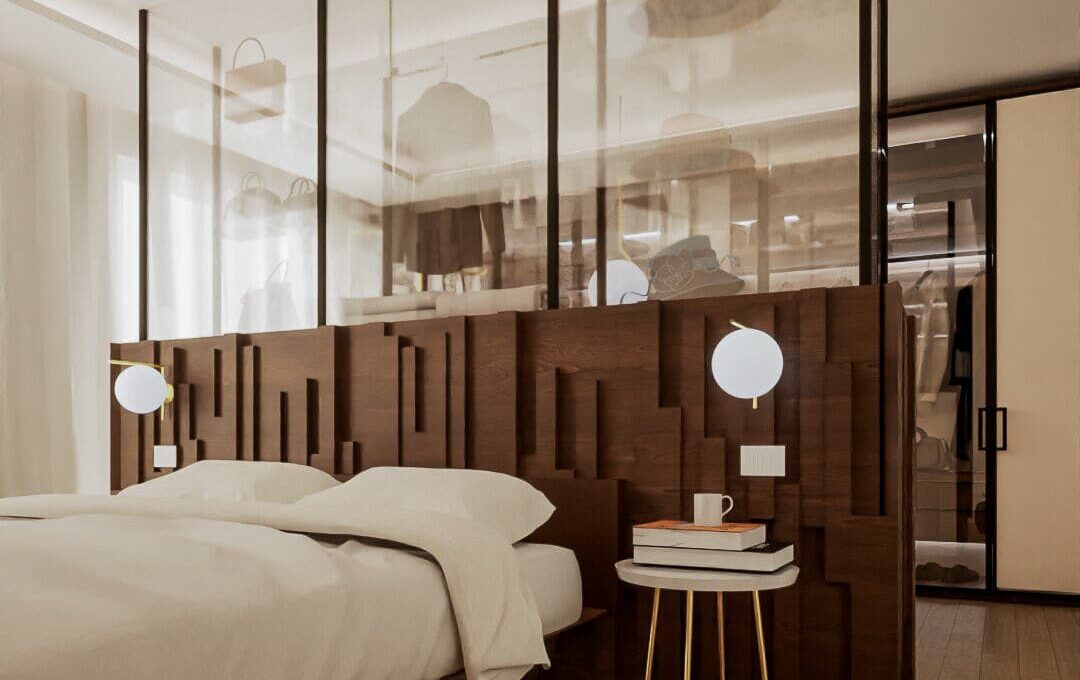 Le pareti vetrate della cabina armadio trasformano gli abiti in elementi d’arredo, mentre la testata in legno con pattern geometrico aggiunge profondità e carattere. Tocchi di giallo oro nelle lampade ravvivano una palette neutra, creando un equilibrio sofisticato.