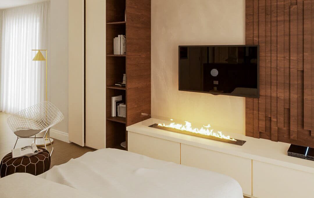 Il camino in bioetanolo e la libreria integrata rendono lo spazio fluido e multifunzionale, perfetto per chi cerca un rifugio che ispiri ogni giorno. Un progetto che dimostra come il design possa migliorare il modo di vivere gli spazi.