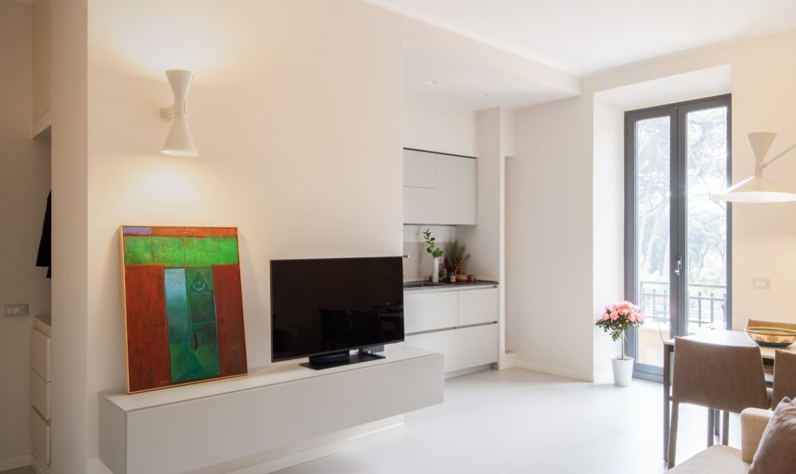 Questa parete è un elemento architettonico fondamentale; ha permesso di dividere il soggiorno dalla cucina ma evitando di chiudere troppo lo spazio; inoltre ha dato la possibilità di alloggiare comodamente la tv, e creare una nicchia per posare i cappotti all’ingresso e dall’altro lato ospitare il frigorifero.