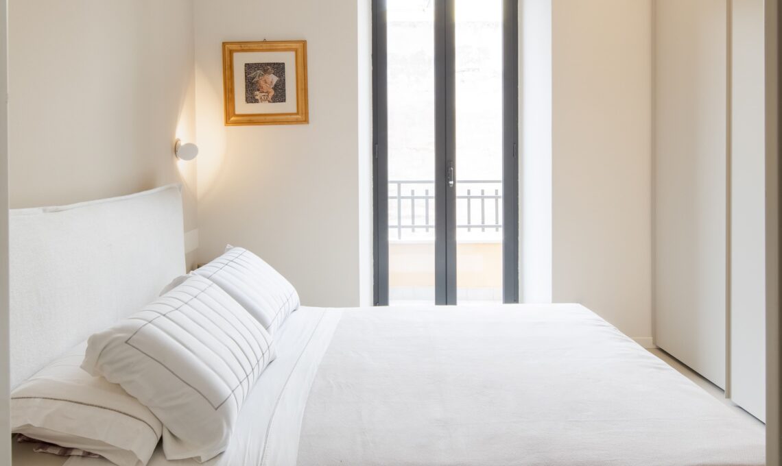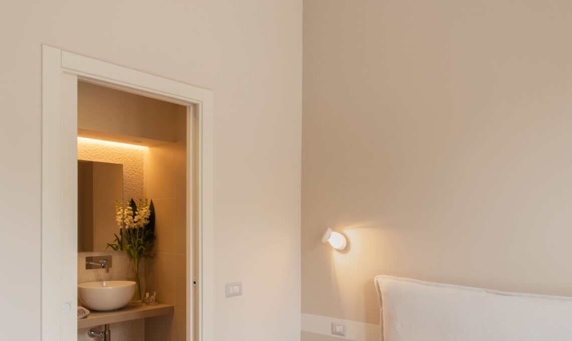 Anche per la zona notte il ridisegno della pianta ha dato un valore aggiunto, il semplice gesto di cambiare la parete in cui alloggiare la porta di ingresso al bagno en suite ha fatto la differenza, prima una volta aperta la porta della camera ci si trovava direttamente di fronte a quella del bagno, ora invece avendo spostato la porta sulla parete laterale il passaggio è più graduale e anche la disposizione degli arredi del bagno è più funzionale. Questo e l'utilizzo del bianco per le pareti e gli arredi ha reso questo bagno molto più grande e luminoso.